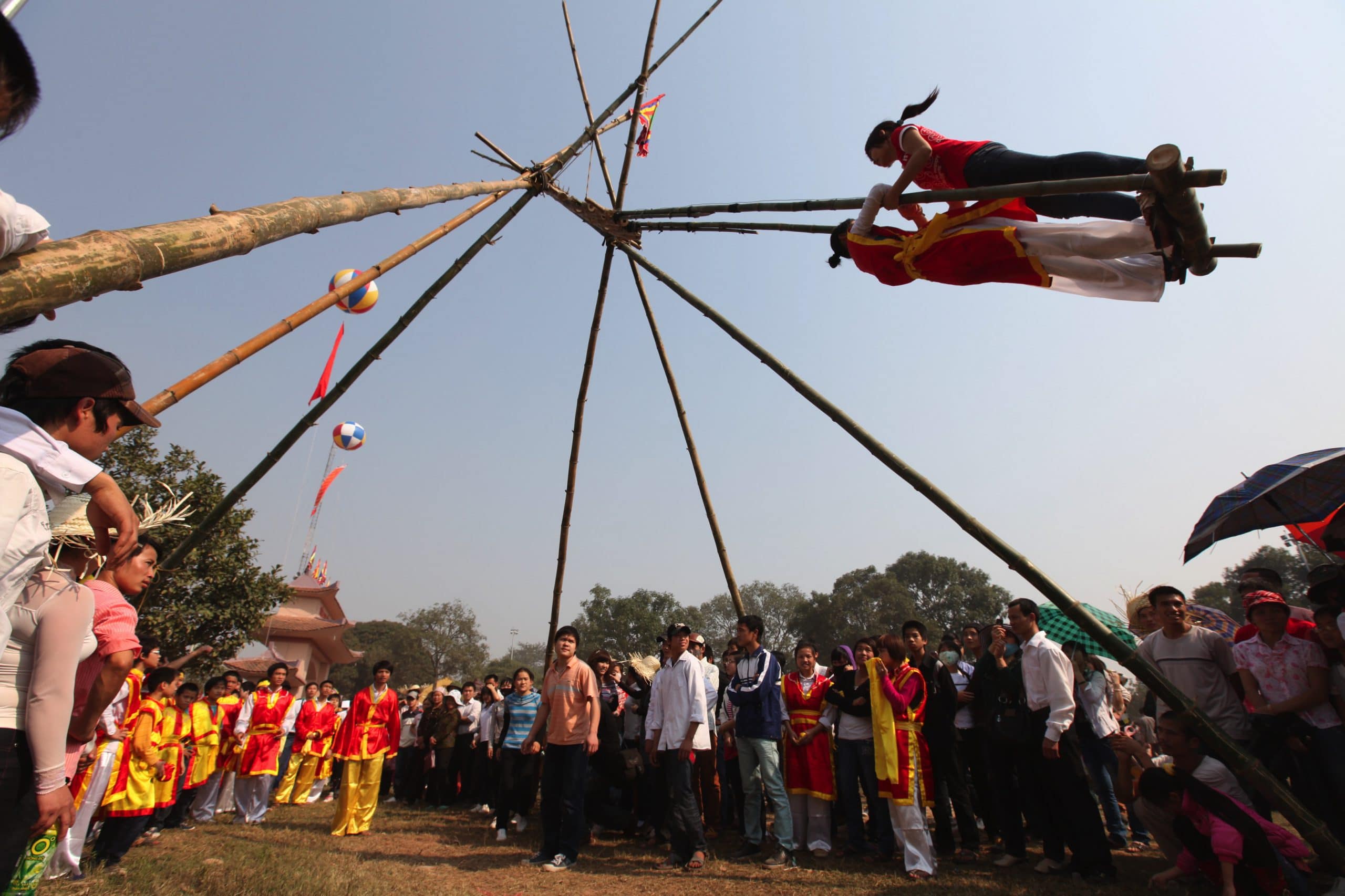 Xưa kia, ba ngày Tết sân đình, trường làng là nơi vui nhất. Các trò chơi dân gian được tổ chức lôi cuốn mọi người, tiêu biểu nhất là Hô hát bài chòi đầu xuân. Đây vừa là trò chơi, vừa là hình thức diễn xướng múa hát vui nhộn, thỏa mãn thị hiếu của lớp người cao tuổi. Bà con các dân tộc sinh sống ở vùng Trường Sơn – Tây Nguyên cũng ăn Tết như người Kinh, tiếng cồng chiêng ngân vang, điệu múa xoan, múa tân tung rộn ràng khắp buôn làng. Vũ điệu cồng chiêng của trai gái bên cây nêu thể hiện tâm hồn, sức sống mạnh mẽ của đồng bào miền núi. Nhiều lễ hội trong Nam ngoài Bắc cũng được khai mở vào ngày đầu năm như lễ Xuống đồng của người Mông, người Tày, hội Lim của vùng quan họ Bắc Ninh, lễ hội hoa ban… và đó cũng là dịp để con người sáng tạo và hưởng thụ các di sản văn hóa.