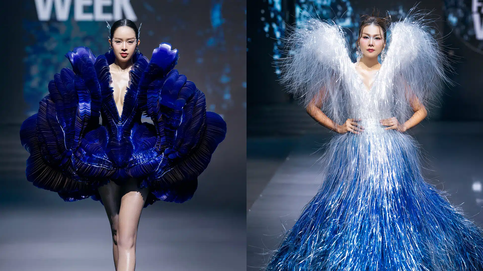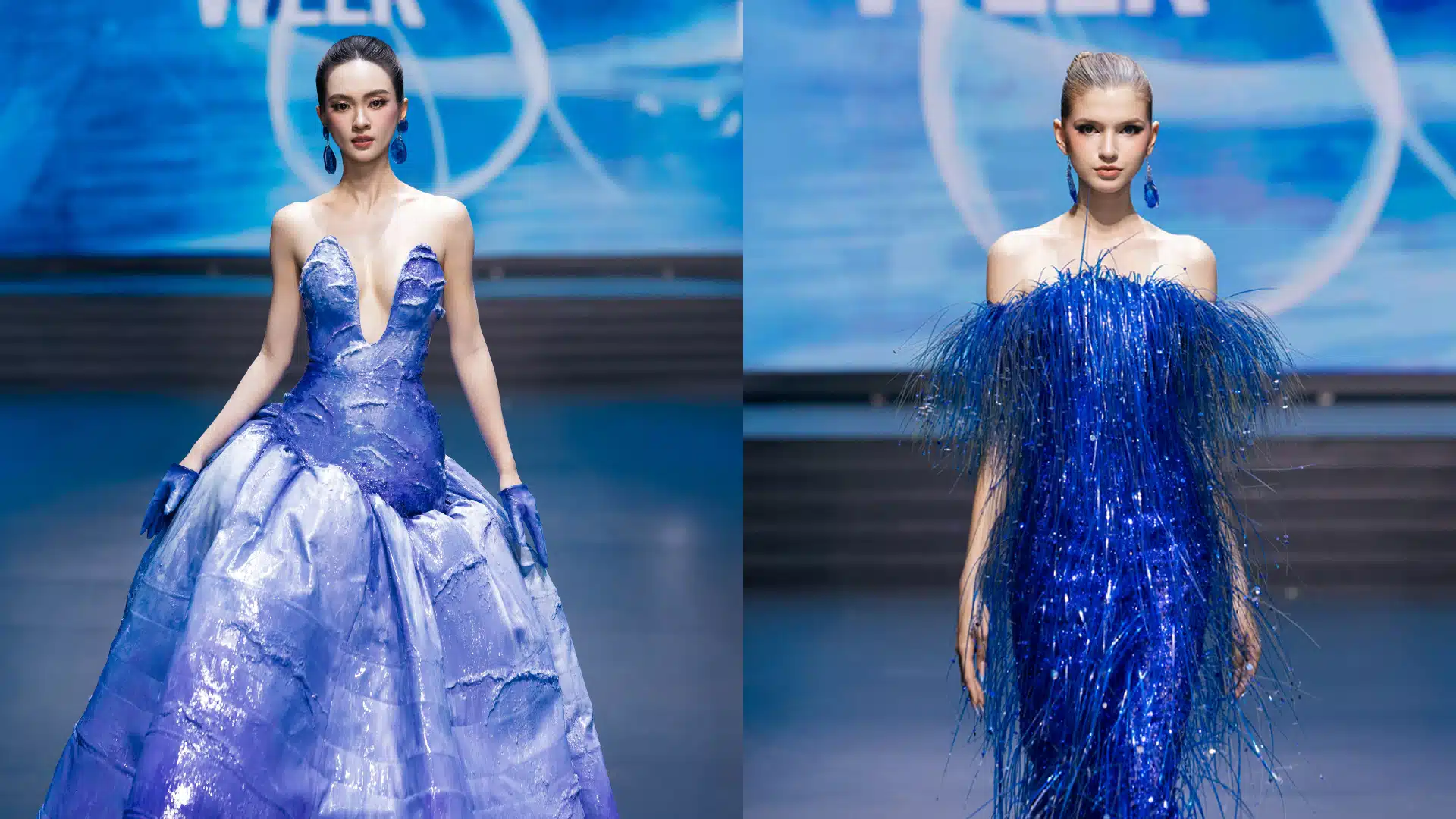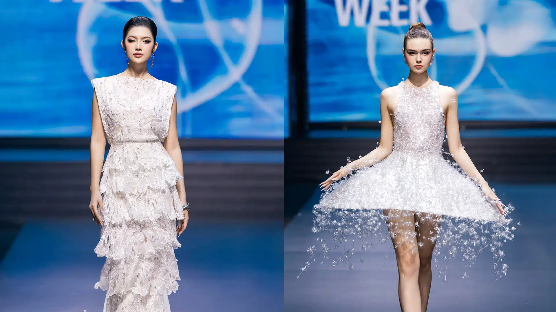 “The Light of Water” không chỉ thu hút bởi sự tham gia của dàn chân dài đình đám như Á hậu Lệ Hằng, Miss Cosmo Campuchia 2024 Leakena, Á hậu Phương Anh… mà còn bởi ý nghĩa sâu sắc về sự biến hóa, linh hoạt và bản chất thuần khiết. Các thiết kế, với gần 40 mẫu, sử dụng kỹ thuật draping khéo léo, bảng màu chuyển từ trắng tinh khôi, xanh aqua đến ánh bạc bắt mắt, cùng chất liệu thân thiện môi trường như lụa Mã Châu, taffeta và chi tiết tái chế từ chai nhựa Aquafina, mang đến khoảnh khắc ấn tượng về vẻ đẹp tự nhiên của nước.