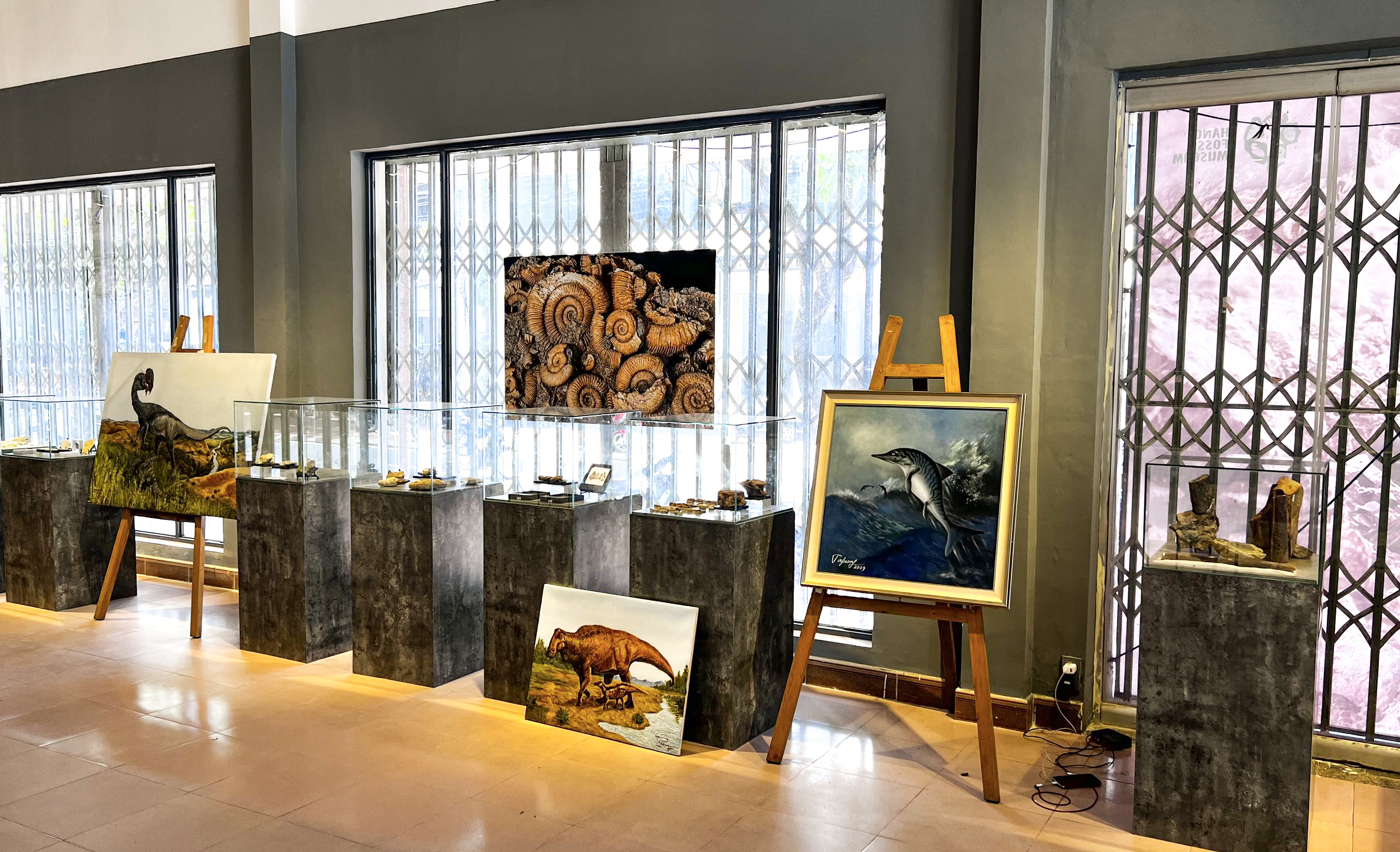 Cũng trong khuôn khổ triển lãm, khách tham quan sẽ được thưởng thức sự giao thoa đẹp đẽ của khoa học và nghệ thuật khi chiêm ngưỡng những tác phẩm hội hoạ đặc biệt được tạo nên bởi sự rung cảm mạnh mẽ của các họa sĩ nổi tiếng nước ta khi đứng trước những mẫu vật hóa thạch có niên đại hàng trăm triệu năm.