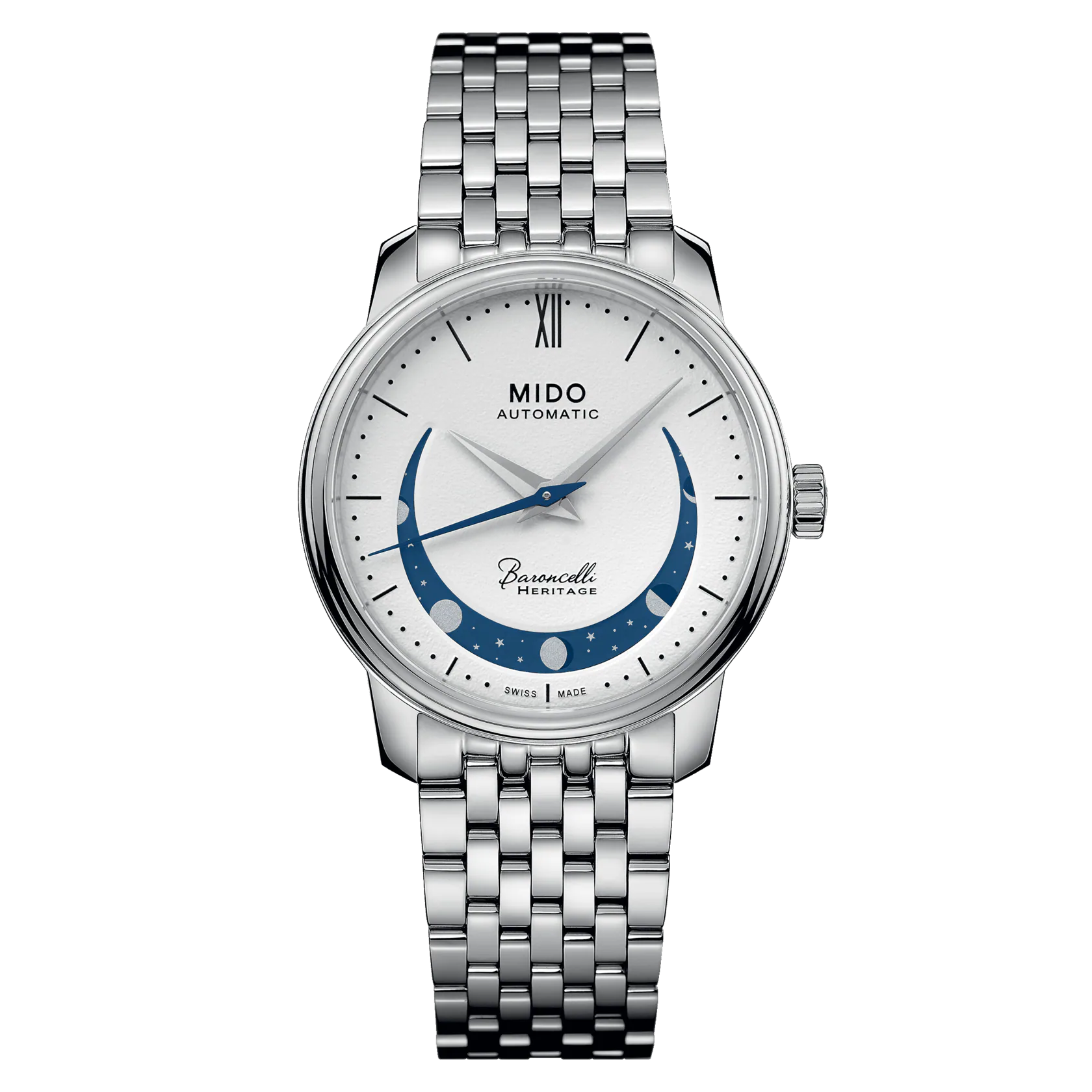 Hiện diện với phong thái trang nhã, hiện đại và mang trên mình Lịch tuần trăng – một trong những cơ cấu hấp dẫn nhất của ngành chế tác đồng hồ, Mido Baroncelli Heritage Smiling Moon chắc chắn sẽ làm bất kỳ ai say lòng ngay từ cái nhìn đầu tiên. Bao bọc bởi chiếc vỏ thép thanh lịch là mặt số màu trắng tinh khôi, biểu thị theo cách thức nguyên bản, thông qua một cửa sổ dạng vầng trăng lưỡi liềm đẹp mắt ở nửa dưới mặt số. Không chỉ vậy, vẻ tinh tế phảng phất nét cổ điển còn được nhấn mạnh bằng các cọc số thanh mảnh, kim giờ với kim phút cắt kim cương được phun cát tỉ mỉ. Baroncelli Heritage Smiling Moon vận hành bằng bộ máy cơ tự động Mido Caliber 1192 có mức năng lượng dự trữ 42. Ra mắt hai kích cỡ gồm 39mm và 33mm, dòng đồng hồ này phù hợp cho cả nam lẫn nữ. Các cặp đôi trẻ còn có thể sở hữu theo cặp, để bày tỏ tình cảm và sự gắn kết trong những dịp đặc biệt.