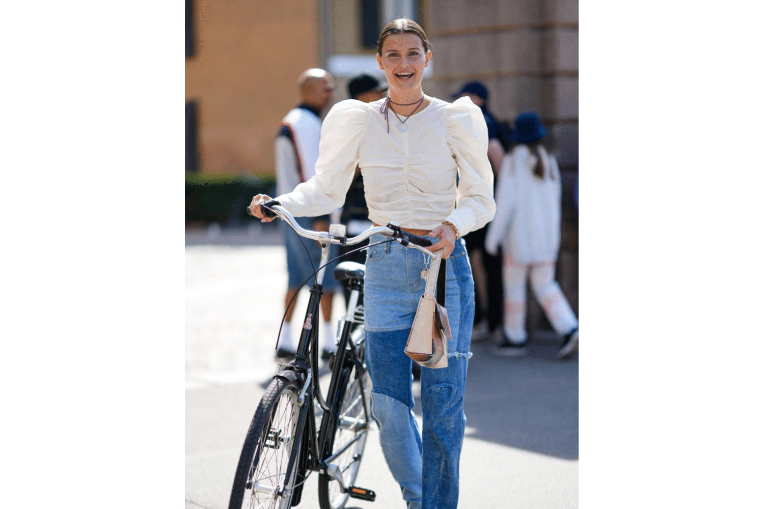 - Quần jeans phồng của Ganni – Với phần eo cao và dáng phồng nhẹ, tạo hiệu ứng thon gọn và hiện đại.