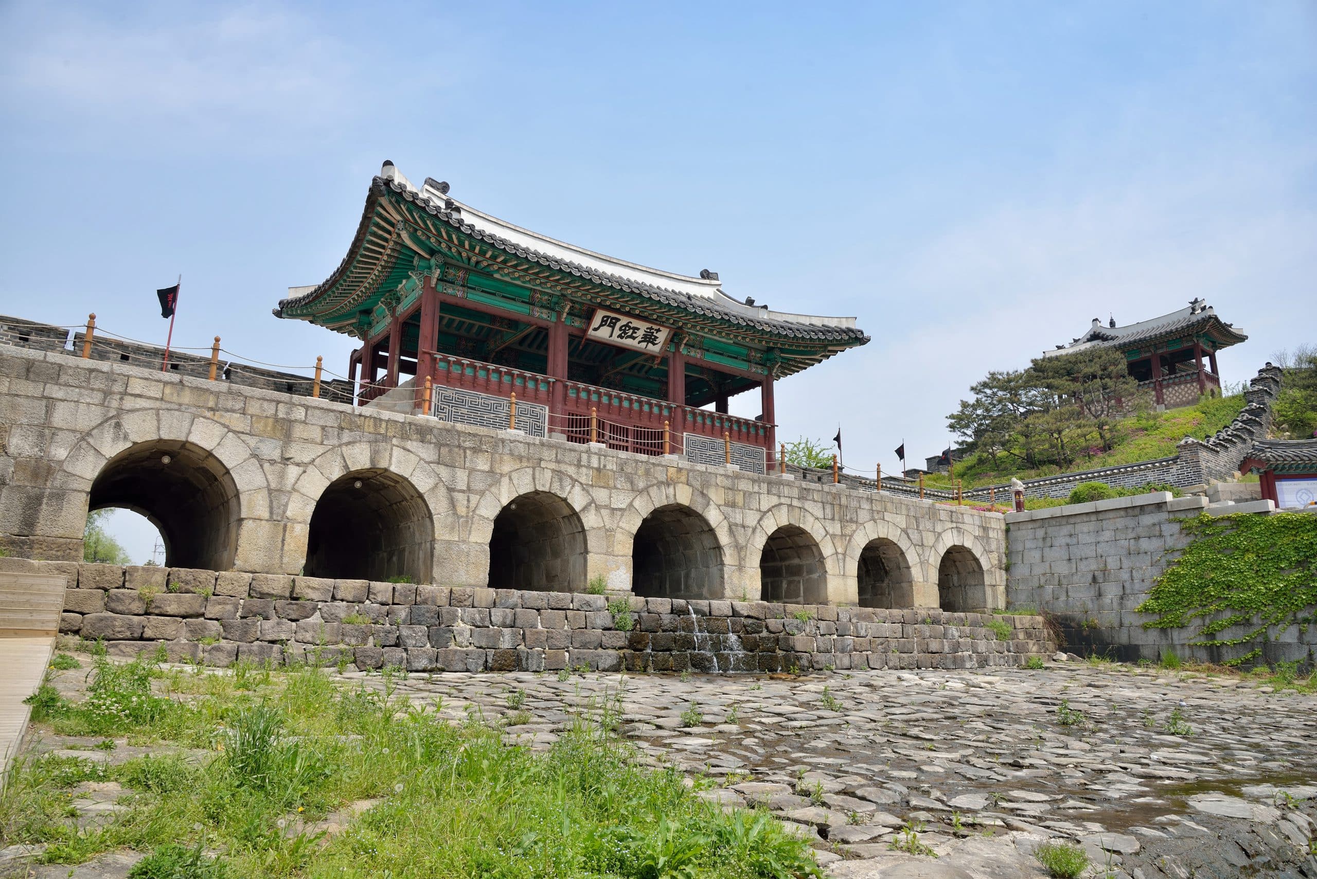 Pháo đài Hwaseong chạy bao quanh khu vực trung tâm thành phố Suwon, một trong những thành phố chính của tỉnh Gyeonggi-do. Pháo đài là biểu tượng của lòng hiếu thảo của nhà vua Jeongjo đối với cha mình. Pháo đài, được xây dựng từ 1794 – 1796, theo kiến trúc rất khoa học, gồm bốn cổng tại bốn hướng Đông, Tây, Nam, Bắc, và cửa Sumun với phong cách bảy vòm. Tường pháo đài được xây bằng gạch Seokjae và Jeondo. Các lỗ giữa những viên gạch chỉ là đủ lớn để vừa mũi súng, mũi tên hay giáo dài nhằm mục đích đề phòng các cuộc tấn công. Pháo đài được Unesco công nhận là Di sản Văn hóa Thế giới vào năm 1997.