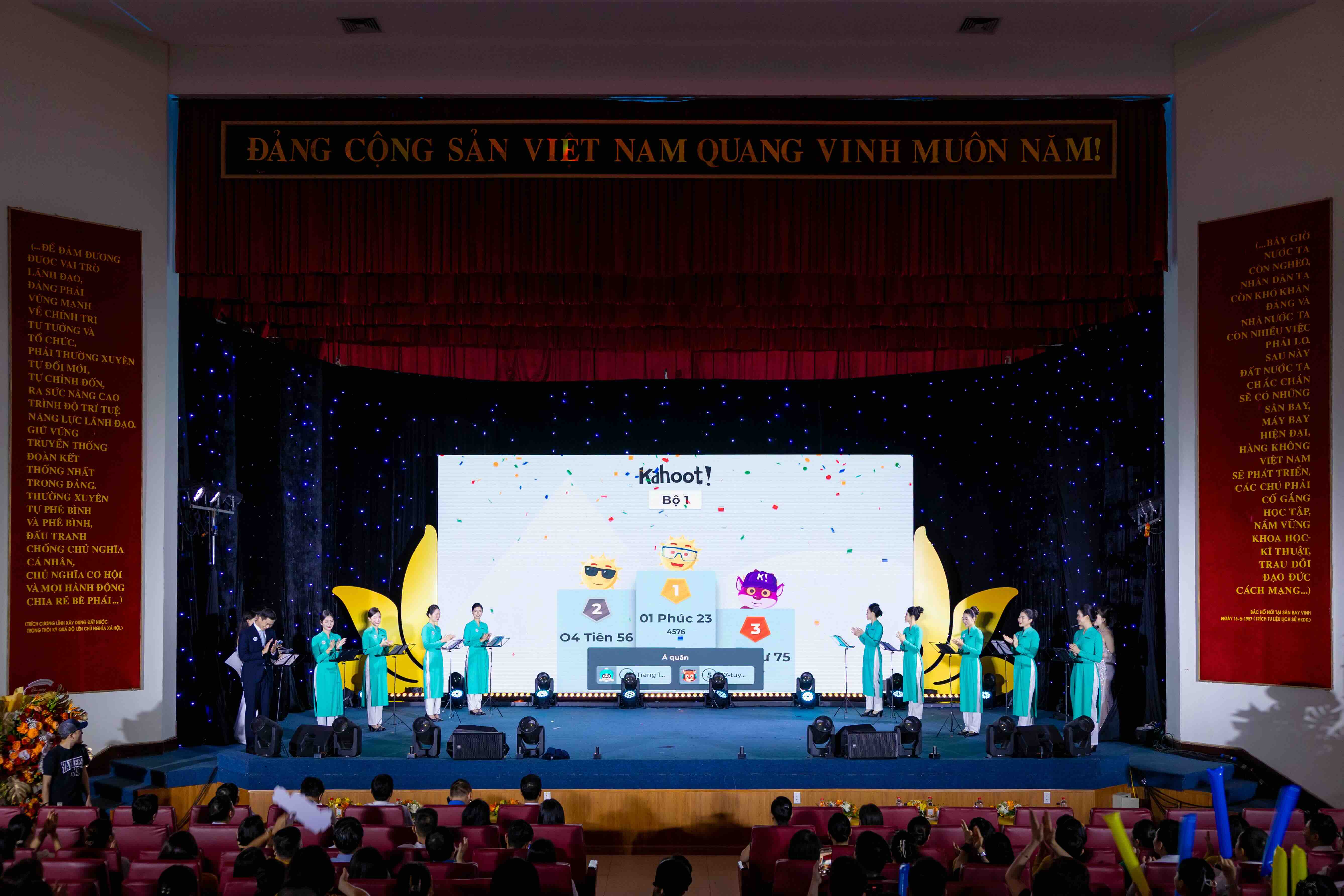 Không khí đêm chung kết trở nên sôi nổi với phần thi Hành trang tiếp viên. Các nhóm thí sinh lần lượt trả lời câu hỏi về nghiệp vụ, an toàn bay, dịch vụ và kỹ năng ứng xử, thể hiện khả năng nắm vững chuyên môn và xử lý linh hoạt mọi tình huống. Phía sau mỗi câu trả lời là hình ảnh những con người tận tâm, luôn sẵn sàng đồng hành cùng hành khách trên mọi hành trình.