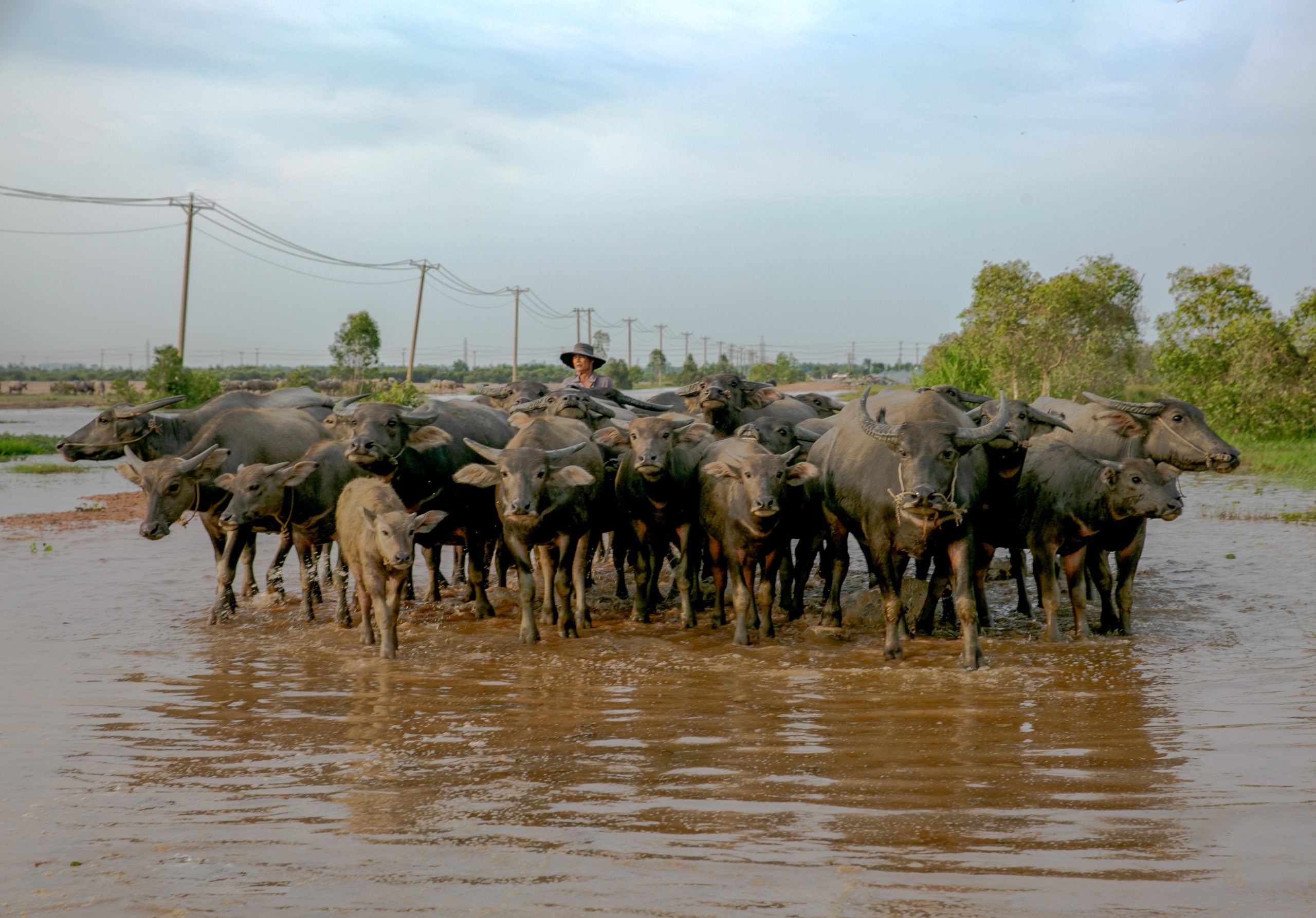 Như thường lệ, ông Năm sáng nào cũng thả trâu và lùa chúng đi ăn cỏ. Khi những con gà cất vang tiếng gáy lúc bình minh là cả đàn trâu chộn rộn thức giấc, lần lượt di chuyển theo hàng trên đường bờ đê và tự do tản ra ăn cỏ. Trâu ở nơi này được thả đi ăn tự nhiên, không có buộc dây dẫn. Một bầy trâu lớn khi len trên đồng có khi của nhiều chủ trâu khác nhau nhưng ít khi nhầm lẫn hay bị lạc vì đối với những người chăn trâu lành nghề, nhìn vào đàn là nhận ra trâu của mình. Lũ về, cỏ dồi dào, trâu ăn nhiều, con nào con nấy đều khỏe và mập tròn nên người chăn trâu không cảm thấy mệt bất kể len trâu lúc nắng hay mưa dầm. Trên bờ ruộng gần đó, lán trại của chủ trâu dựng tạm để canh giữ đàn trâu chạy đồng và đến chiều tầm 16 giờ thì lại lùa về chuồng.