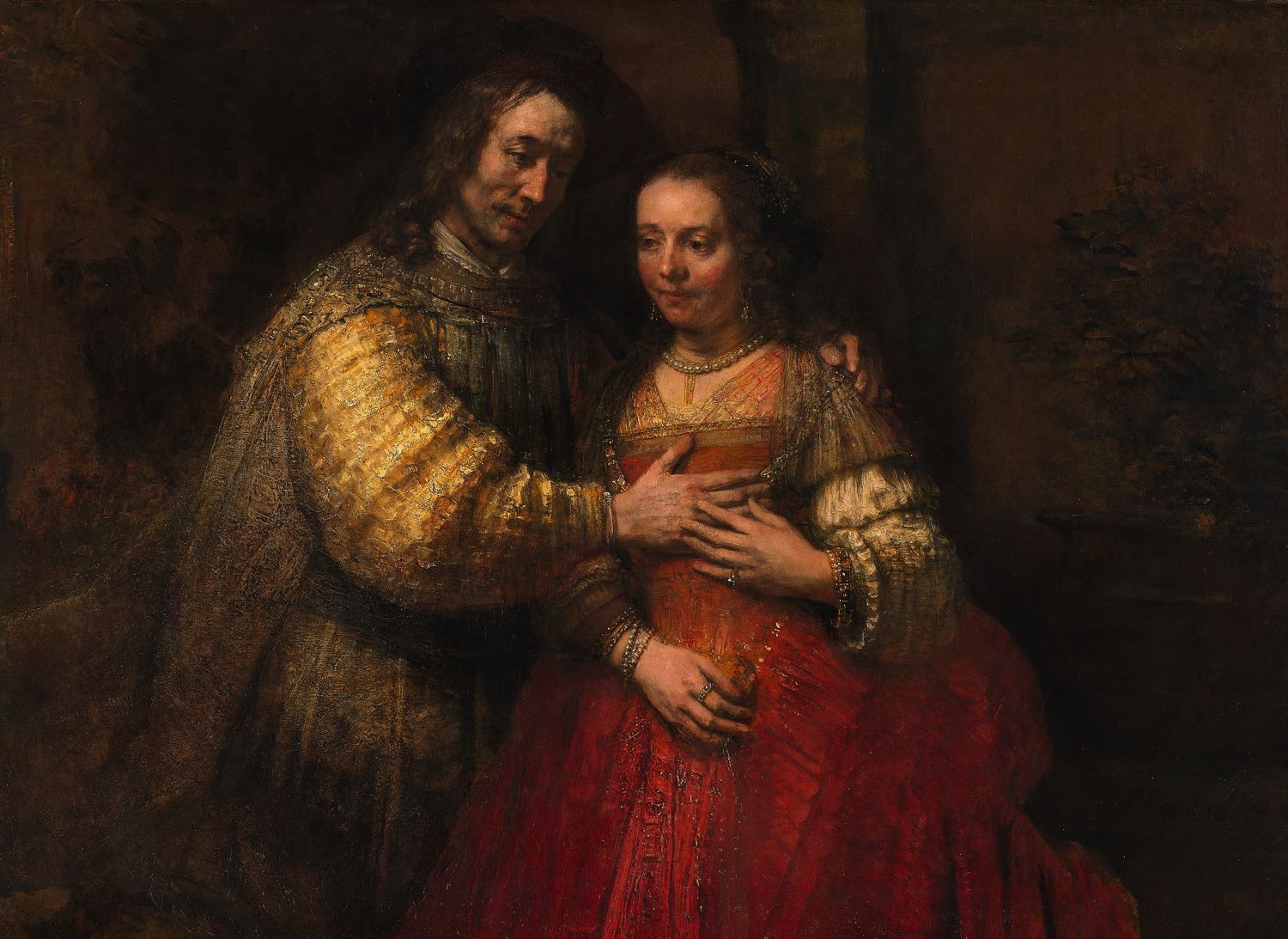 Thoáng nhìn lại lịch sử hội họa thế giới, có một điều lý thú là một trong những bức tranh sớm nhất về đề tài tình yêu đôi lứa lại mô tả… một đám cưới. Đó là kiệt tác sơn dầu Đám cưới Arnolfini vẽ năm 1434 của họa sĩ Phục hưng phương Bắc Jan van Eyck. Trong bức tranh, hạnh phúc viên mãn và lời thề cam kết của cặp đôi được thể hiện qua hành động cầm tay, sau này trở thành một mô-típ phổ biến, như được thấy ở tác phẩm Lùm cây kim ngân (vẽ năm 1609) của danh họa Baroque Peter Paul Rubens tự họa vợ chồng mình, hay Cô dâu Do Thái (vẽ khoảng 1665–1669) của danh họa thời Hoàng kim Hà Lan Rembrandt.