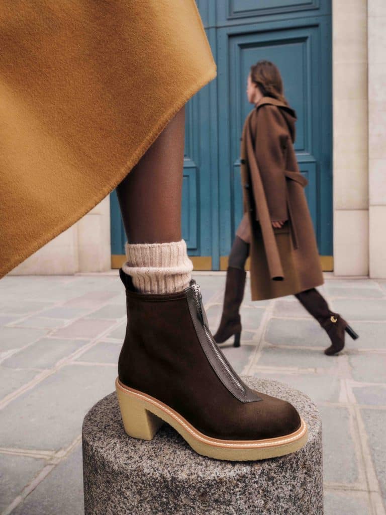 Không tìm cách thổi phồng hay làm quá, những đôi giày nữ Hermès tuân thủ nghiêm ngặt tư duy thẩm mỹ của thương hiệu: tinh tế và thực dụng. Ankle boots bằng nhung da dê phối da bê màu hạt dẻ được phối khóa kéo ở mặt trước, gợi nhớ tới các thiết kế ủng cưỡi ngựa tiện lợi. Combat boots phối khoen xỏ dây điển hình, lấy cảm hứng từ những đôi giày địa hình với bộ đế gai góc. Giày búp bê phối quai gài ngang nữ tính, bổ sung diện mạo yêu kiều cho tủ đồ nữ mùa Thu Đông. Và không thể không kể đến mẫu ủng cao cổ gợi nhắc về những đôi ủng đi mưa, tuy nhiên được biến tấu với bộ đế khéo léo nâng niu gót chân và hoàn thiện bằng da bê mịn màng, mềm như lụa.