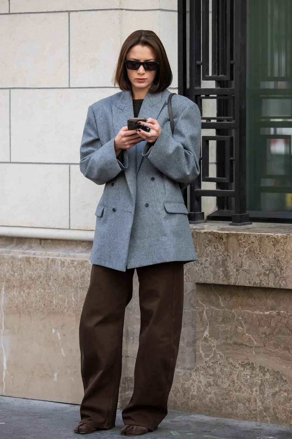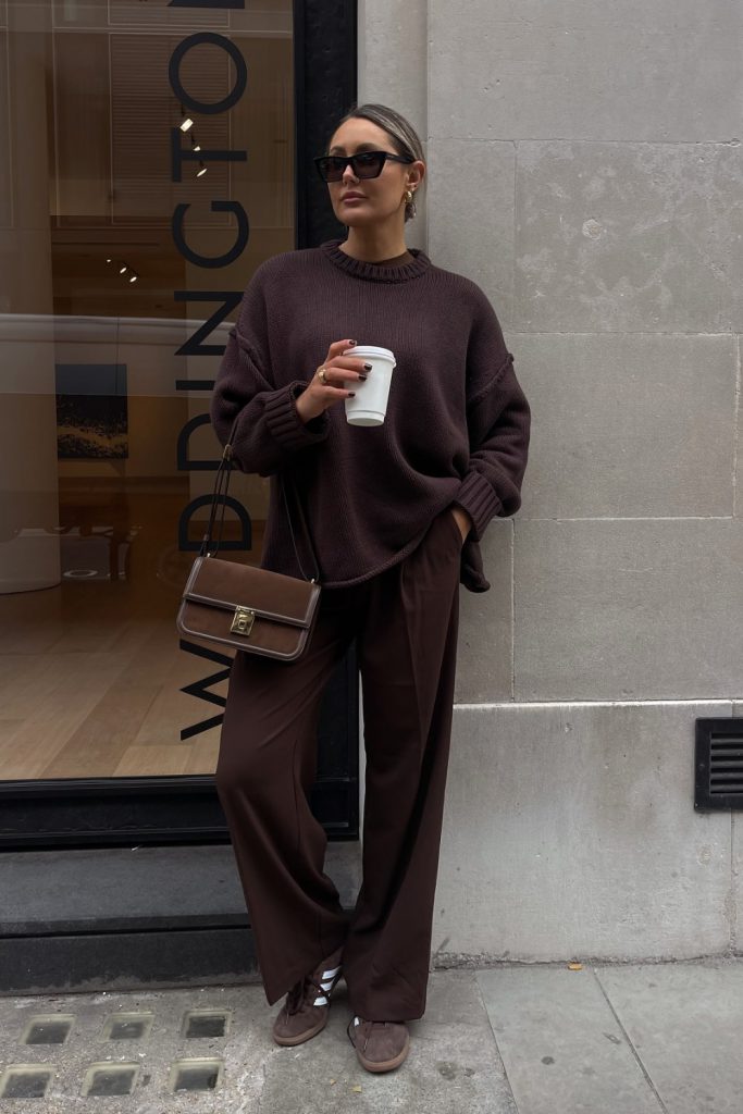 Chỉ một chiếc áo len nâu oversize phối cùng quần ống rộng đồng điệu cũng đủ mang lại vẻ thanh lịch tối giản – kiểu thanh lịch đặc trưng của những quý cô hiện đại.