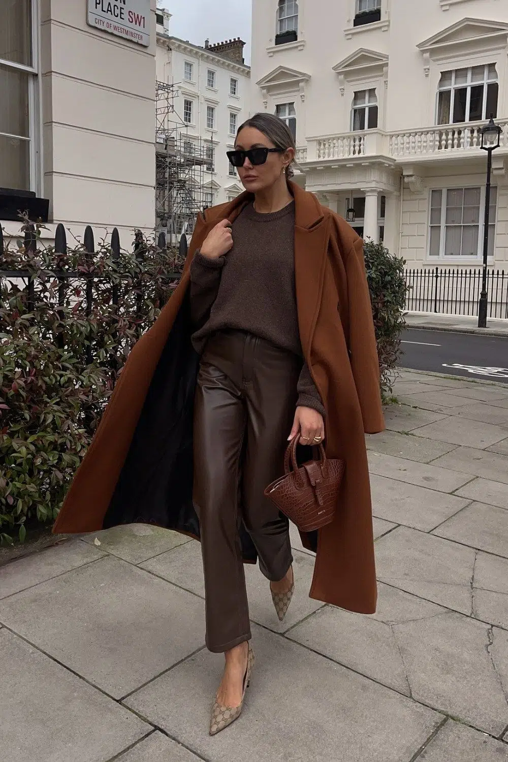 Với những cô nàng yêu phong cách tinh tế, áo khoác camel khoác ngoài áo len nâu và quần da tạo nên tổng thể hài hòa, sang trọng từ đầu đến chân – phong cách chuẩn tạp chí cho mùa đông năm nay.