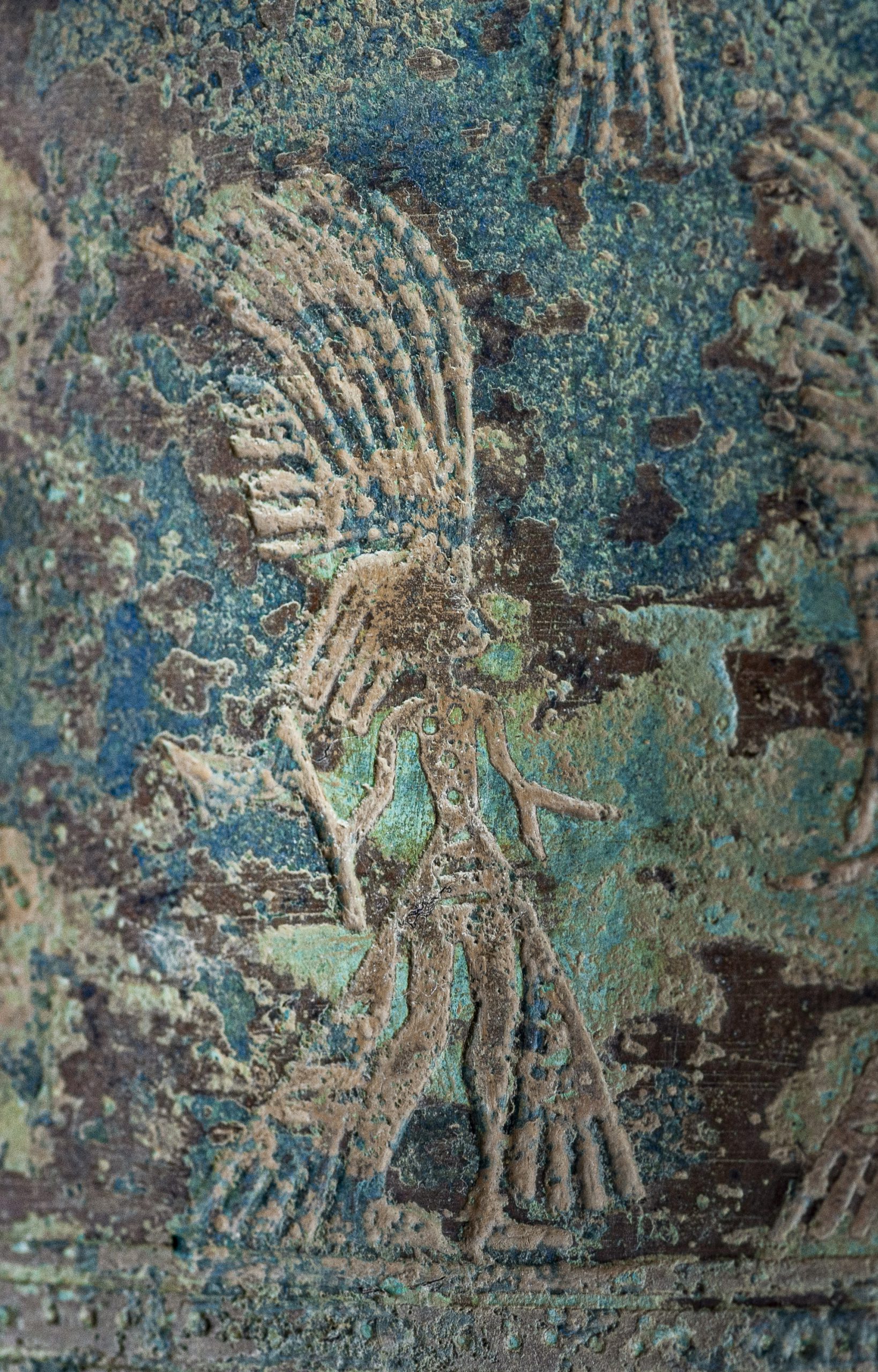 Một số họa tiết hình người lại được cách điệu hóa, chỉ còn là những đường nét cong và gạch ngắn nhưng vẫn thể hiện được hoa văn hình tròn chấm giữa tượng trưng cho đôi mắt mà nhiều học giả đặt tên là họa tiết hoa văn “cờ bay”.
