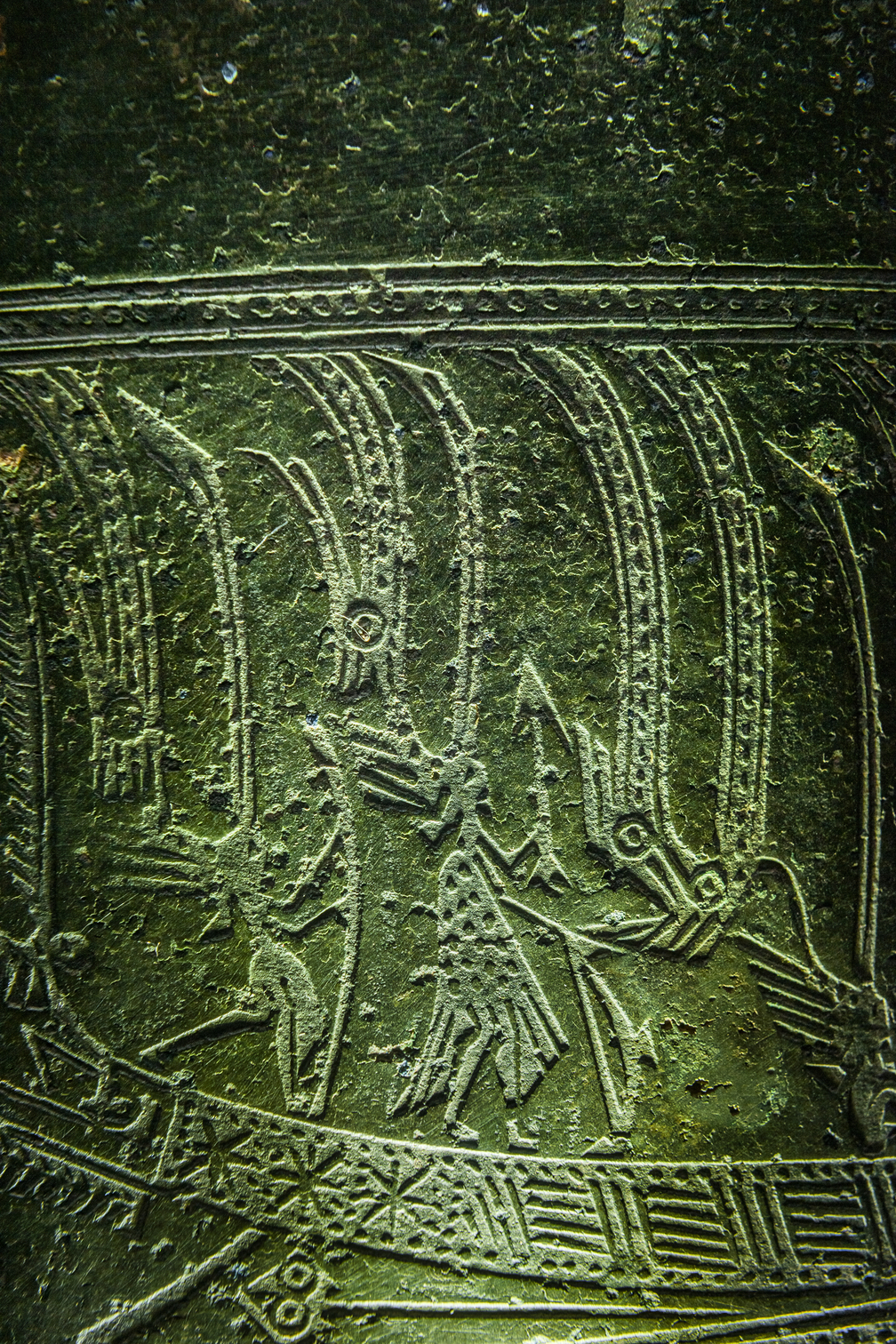 Người xưa còn miêu tả chính mình trong bộ trang phục ngày hội: đầu đội mũ lông chim, thân được choàng loại váy cũng được kết bằng lông chim. Đôi khi họ đang trong tư thế múa trong ngày hội, tay xòe ra hay đang trong tư thế chèo thuyền, tay cầm mái chèo. Có khi, hình người được miêu tả khá sinh động: cầm dùi gõ trống da, đứng trên lầu thuyền cầm giáo dài, một tay cầm cung, một tay cầm tên, có khi đang cầm rìu chiến, giáo để chuẩn bị giết bò trong lễ hiến tế, hình người đang trong cảnh đôi trai gái giã gạo chày tay, một tốp người ngồi đánh trống đồng… Hoa văn hình người còn được miêu tả theo thân phận khác biệt: người thủ lĩnh thì thường đứng trên lầu thuyền, có khi đội mũ cắm tới 5 lông chim, trong khi người chèo thuyền thì nhiều khi không mặc áo, quần chỉ cởi trần và đóng khố. Một số hoa văn hình người sắp bị hành hình trong lễ hiến tế thì hoàn toàn không mặc gì, cũng không được đội mũ lông chim, có lẽ họ là tù binh hay là người được chọn để hiến tế trên sông trong lễ cầu mưa?