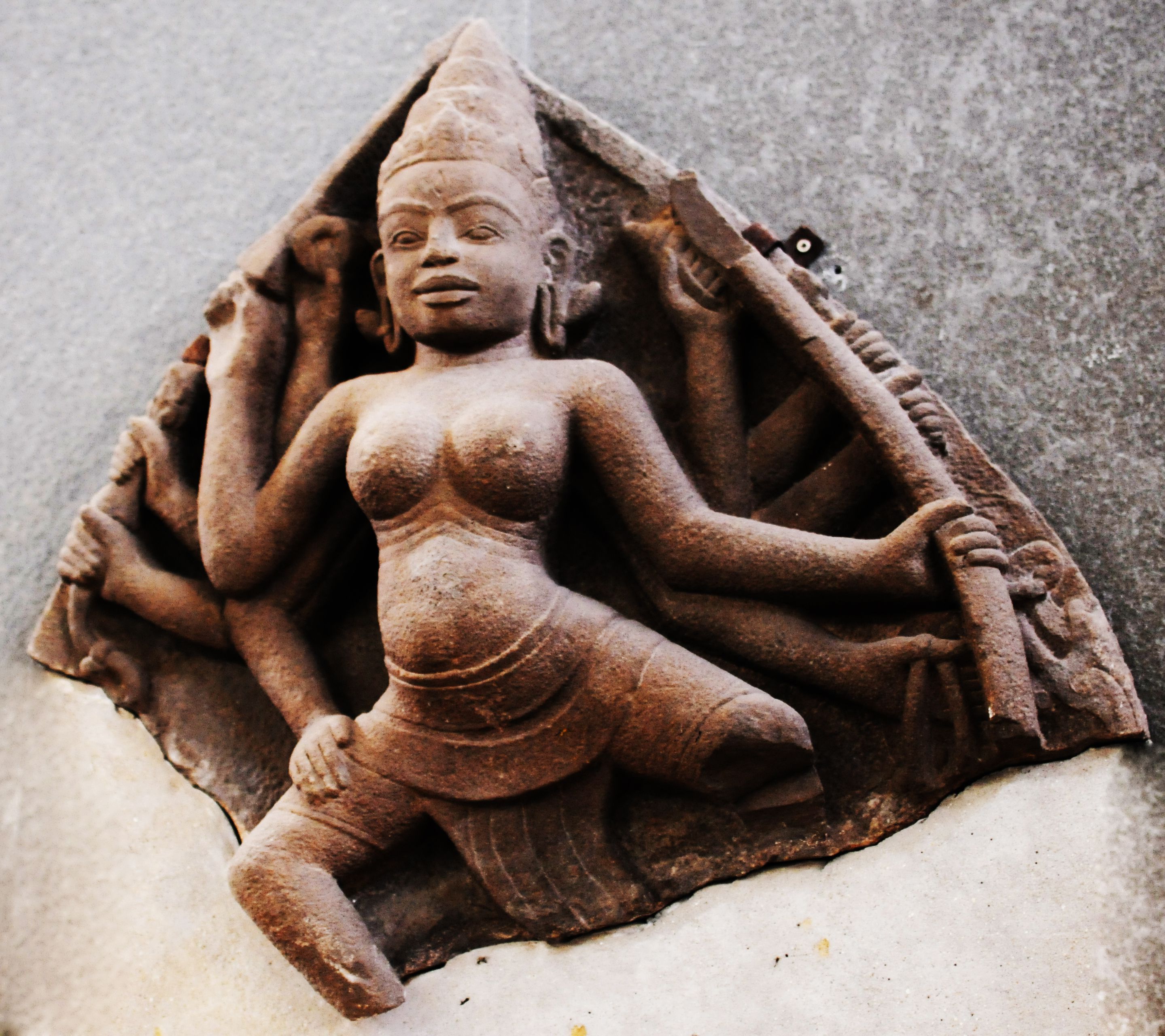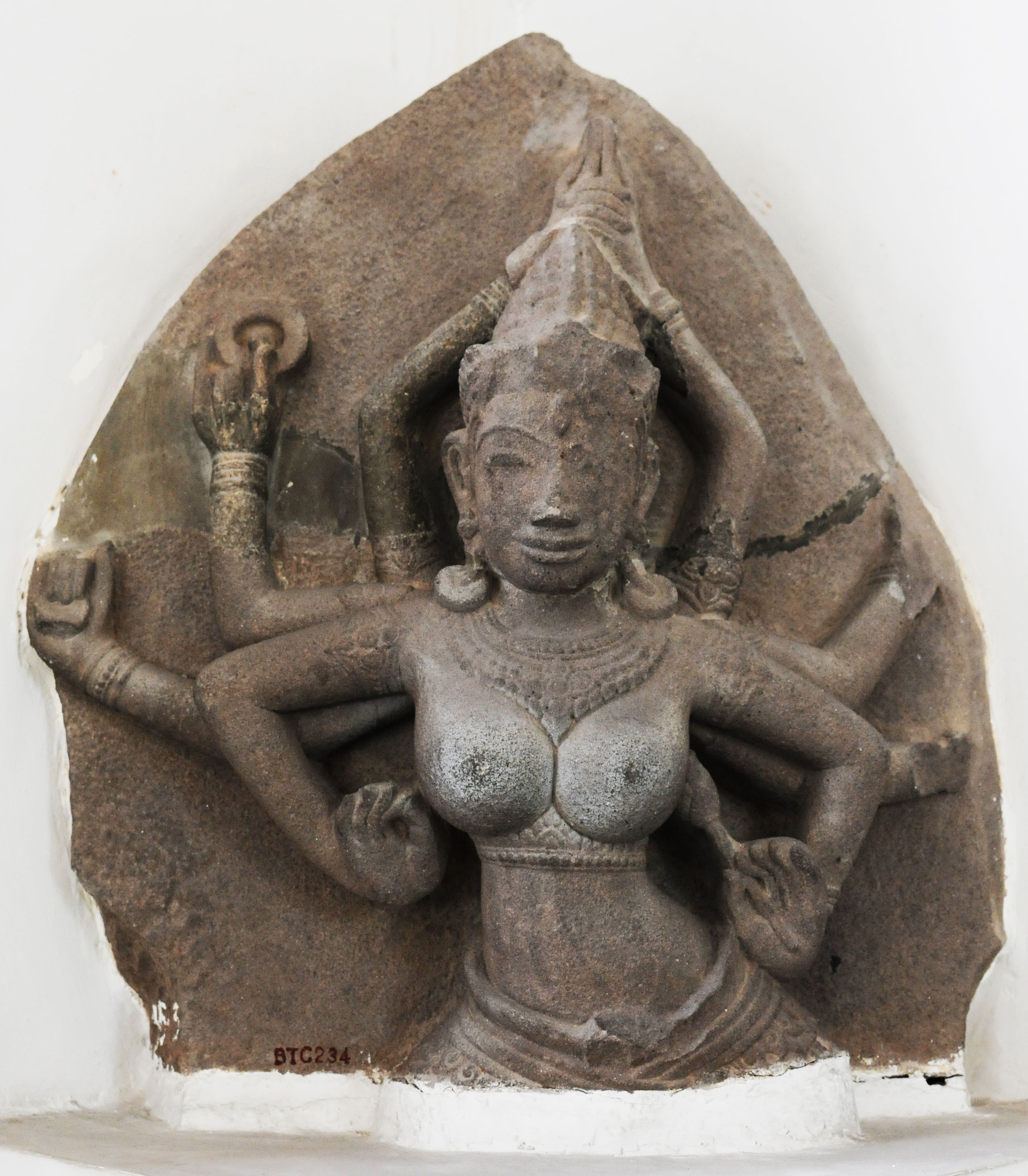 Dường như khi chiêm ngưỡng bức tượng nữ thần này, người ta cảm thấy nó không phải được tạc bằng đá vô tri vô giác mà là hình ảnh đầy sống động của một vẻ đẹp trăng tròn thiếu nữ. Nghệ nhân Chăm cũng không quên tạc chiếc mũ đội đầu nhiều tầng, tai đeo trang sức hình tua, tay đeo vòng. Chiếc váy bó chặt vào hông có dải cuốn đằng trước cũng được chạm khắc hoa văn hoa thị bốn cánh.