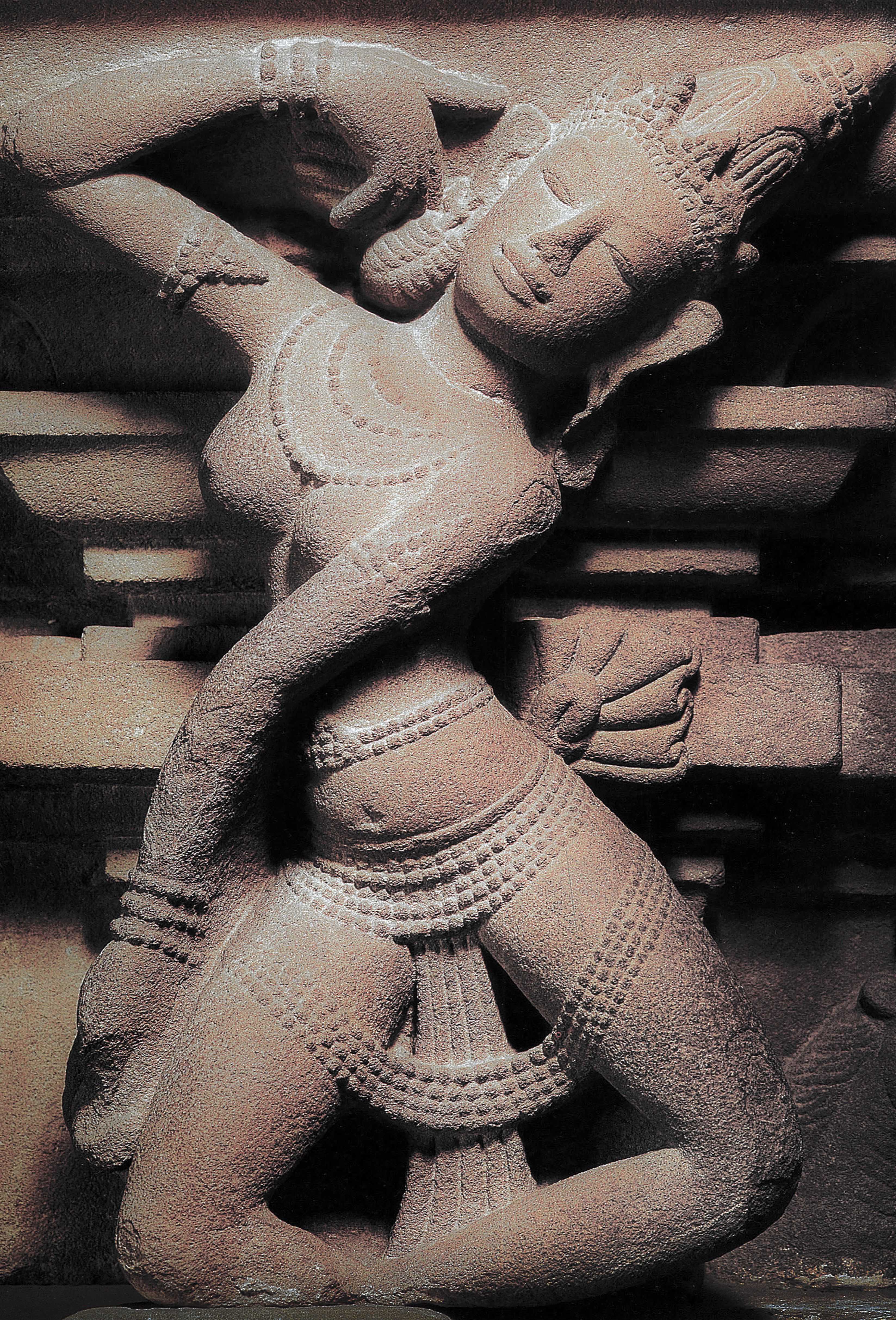 Bên cạnh các nữ thần đang trong tư thế múa, mà ắt hẳn mỗi bức tượng đều chất chứa nhiều biểu tượng và cốt chuyện không dễ diễn giải ngữ nghĩa, ngọn nguồn, là các vũ nữ đích thực. Đó là các vũ nữ Apsara. Theo tích truyện thì đó là các tiên nữ sống trên thiên đường của thần Indra. Họ là hiện thân của vẻ đẹp và tài năng ca múa. Điêu khắc đá Chăm miêu tả cảnh một dàn nhạc lớn đệm đàn có Apsara múa như dàn nhạc cung đình ở Mỹ Sơn, thê kỷ 11. Các vũ nữ đội mũ, mặc váy có dải thả đằng trước, chân choãi, bộ ngực căng tròn. Đôi tay mềm mại giơ lên quá đỉnh đầu hoặc một tay giơ cao, một tay áp ngực. Người ta có thể thấy các nhạc cụ trong dàn nhạc: kèn Sanarai, trống Ghinăng, chiêng. Một dàn vũ nữ khá đồng điệu trên mảng chạm Quy Nhơn, niên đại thế kỷ 11- 12 có dáng thế tay khá đẹp: tay trái giơ lên, tay phải đặt lên ngực. Hai tay nhập lại tạo nên đường viền cong tròn mềm mại. Hai chân choãi, một chân nhón gót tạo nên một tư thế động, nhún nhảy.