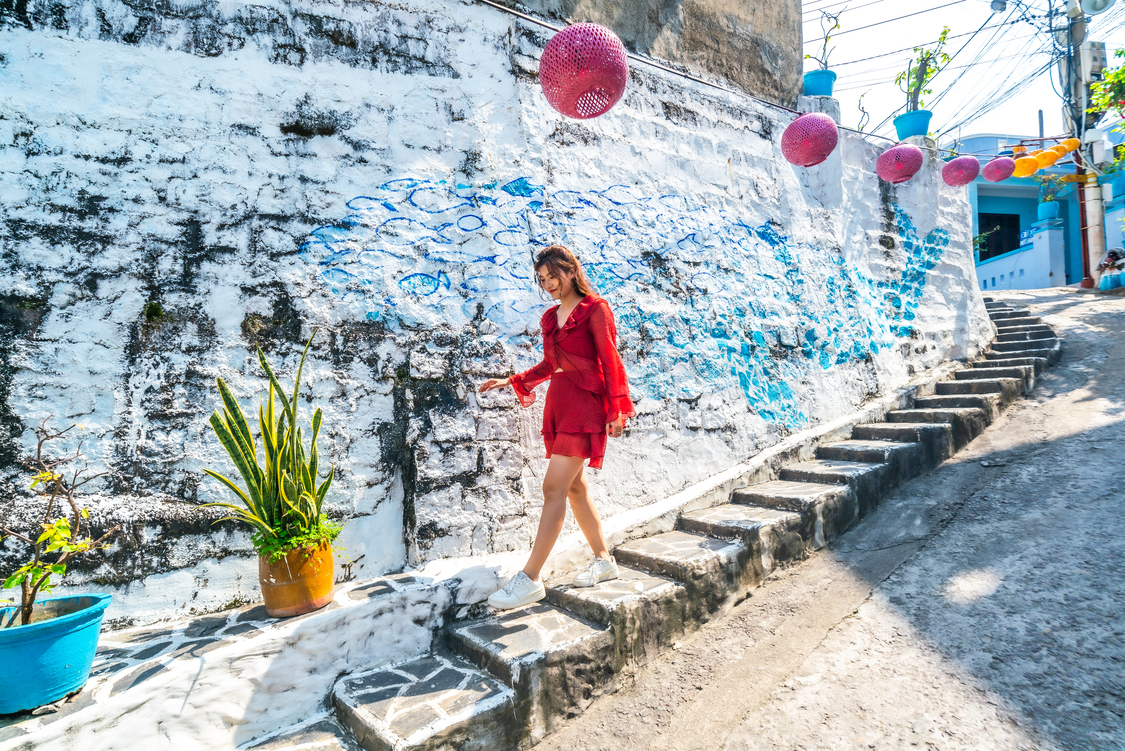 Theo chân hướng dẫn viên bản xứ, chúng tôi đến Nhơn Lý vào một ngày đầu hè. Vì xuất phát từ thành phố khá muộn nên khi tới đây, nắng đã lên cao. Nhìn từ xa, nắng nhảy nhót như những hạt thủy tinh lấp lánh trên mặt biển xanh ngắt. Những mái nhà lô nhô đượm màu xưa cũ dần hiện ra. Nhà ở Nhơn Lý phổ biến chỉ có 1, 2 tầng, đa phần hướng ra biển. Có nhiều lối nhỏ vào làng, chúng tôi chọn lối đi được lát đá xanh đen mà ở đây vẫn hay gọi là “con đường đá xanh”. Lối đi này thực chất là con ngõ nhỏ quanh co khắp làng, điều đặc biệt là ven hai bên có nhiều bức bích họa rực rỡ, sống động. Cũng vì có những bức họa này mà làng chài ngày càng được biết đến nhiều hơn, trở thành điểm checkin của giới trẻ với cái tên “Làng bích họa Nhơn Lý”. Có rất nhiều chi tiết trang trí ở Nhơn Lý mang màu xanh biển. Chúng tôi vui đùa thốt lên: “Ồ, mình đang ở Santorini rồi này!”. Những ô cửa xanh, những chao đèn xanh, đàn cá khổng lồ màu xanh được trang trí trên một bờ tường men theo con dốc khiến bao du khách thích thú, xếp hàng để chụp hình. Điểm xuyết vào không gian xanh ấy là những rặng hoa giấy trĩu bông hồng rực trong nắng. Làng chài vừa có những con ngõ uốn quanh, vừa có những con dốc thoai thoải lên xuống khiến tôi liên tưởng tới các con ngõ nhỏ thơ mộng ở Đà Lạt hay làng bích họa thu hút đông du khách ở thành phố biển Busan (Hàn Quốc).
