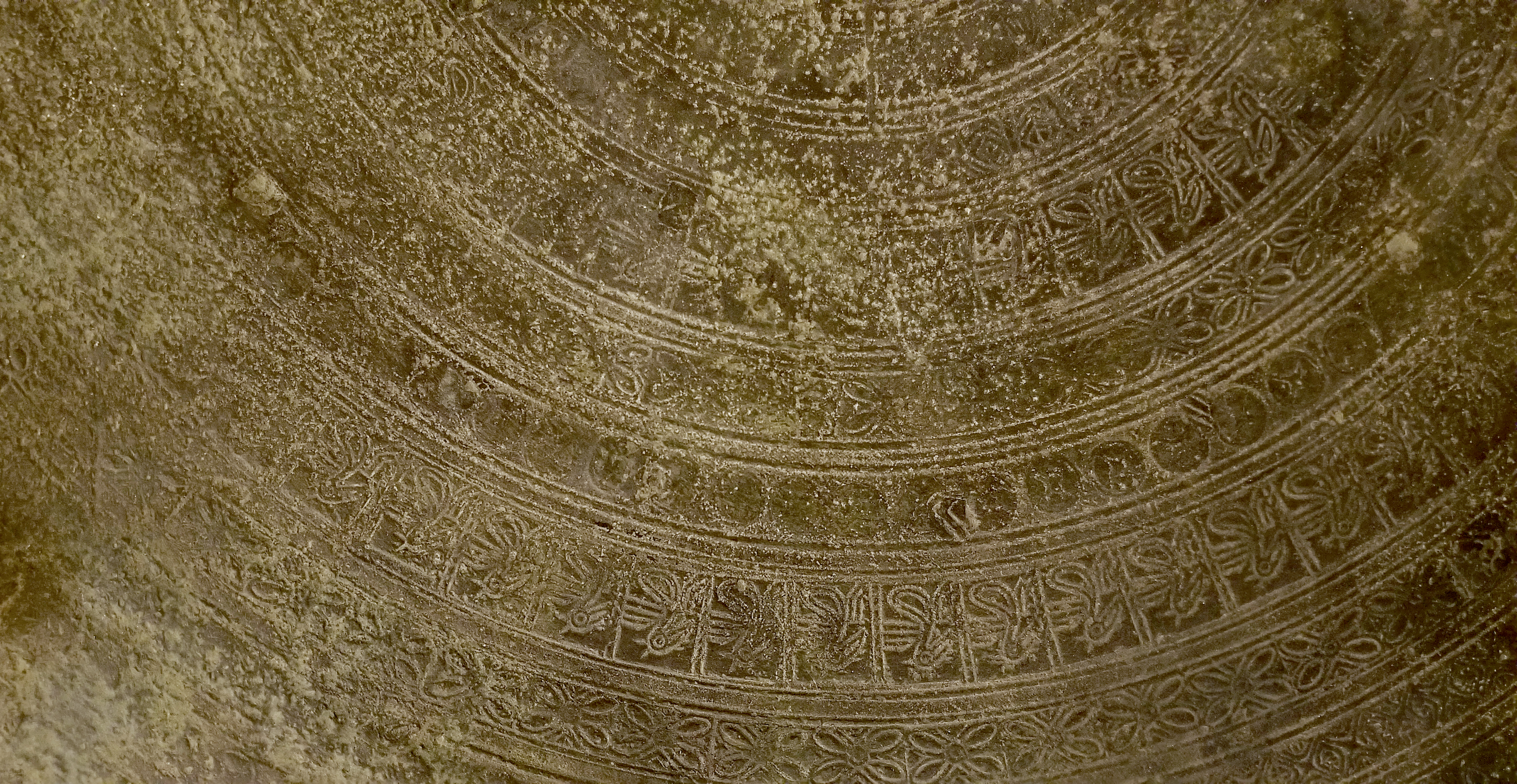 Làm nền cho các khối tượng cóc và khối nổi “mặt trời” là các vành hoa văn đồng tâm, bên trong là các hoa văn ô trám được phủ đầy, tạo ra cảm giác như một tấm thảm trải trên mặt trống đồng. Hoa văn hình ô trám nổi “ganh”, có nhịp điệu, lấp lánh màu đồng vốn có, vàng óng dưới ánh sáng ban ngày hay đèn đuốc ban đêm. Hoa văn trang trí hình ô trám cũng tạo thành các vành phủ đầy trên thân trống tương tự trên mặt trống.