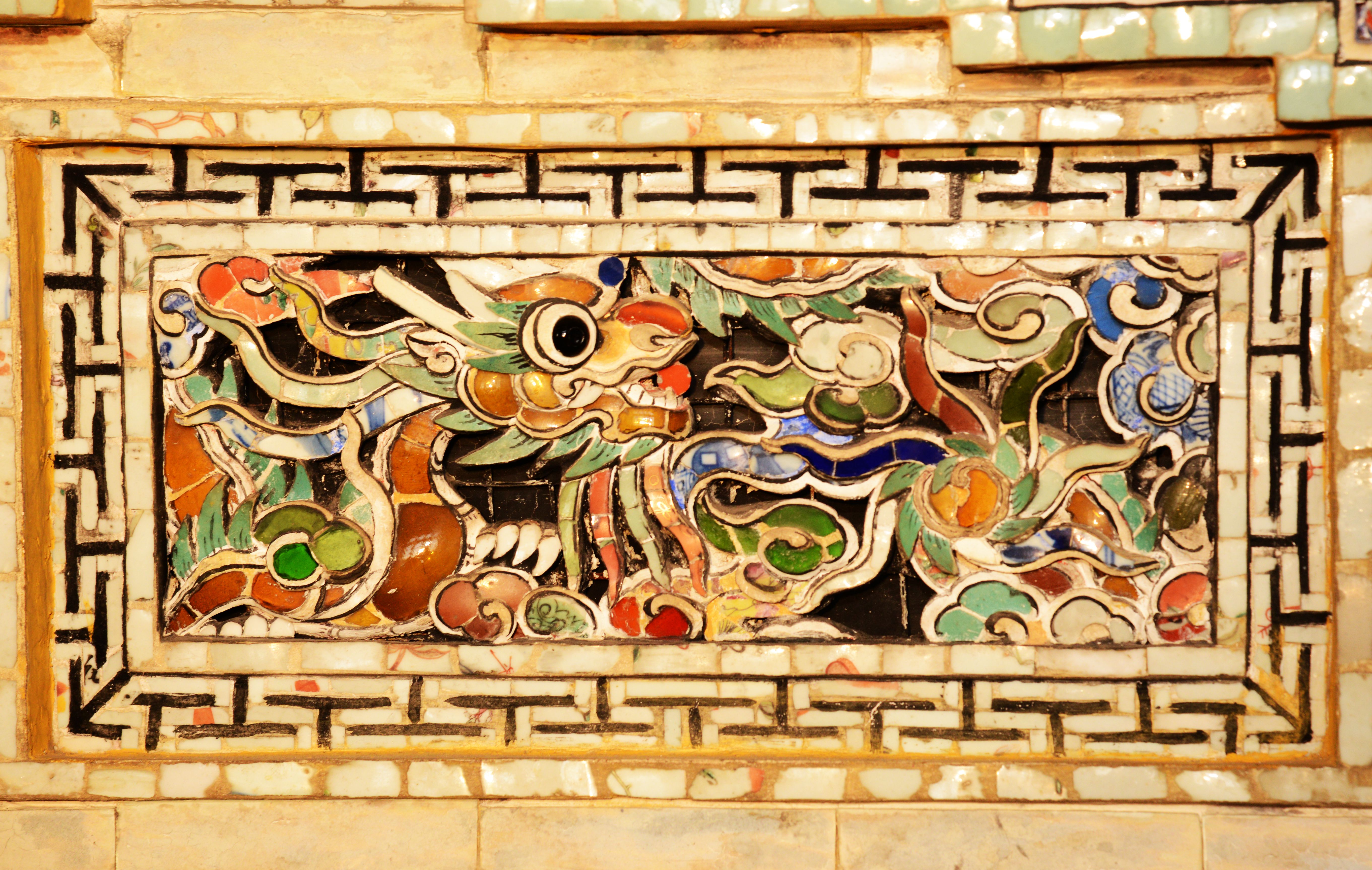 Thư tịch đã ghi lại vào năm 1776, trong tác phẩm “Phủ Biên tạp lục”, nhà bác học Lê Quý Đôn đã miêu tả xứ Thuận Hóa, nay là thành phố Huế: “Tường trong tường ngoài đều xây dày mấy thước, lấy vôi và mảnh sứ đắp thành hình rồng, phượng, lân, hổ, cỏ hoa”. Đấy chính là nghệ thuật mosaic vào thời các chúa Nguyễn. Đến thời các vua Nguyễn, kỹ thuật trang trí ghép mảnh sành sứ đã được sử dụng nhiều. Ngay trong lăng Tự Đức, nghệ thuật mosaic thể hiện ở việc trang trí các mảnh sứ men xanh có hình long mã (đầu rồng, thân ngựa) ở tấm bình phong.