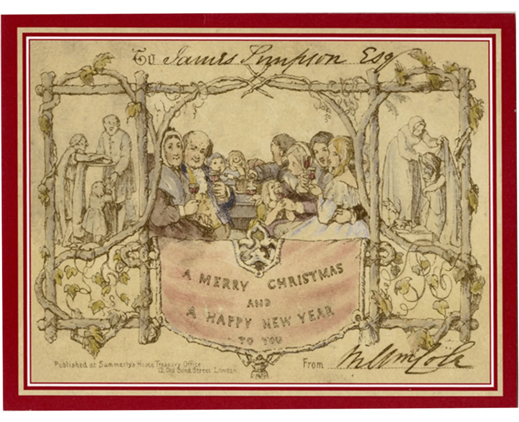 Tiền thân của thiệp Giáng Sinh được ghi nhận trong một bức thư gửi Vua James Đệ Nhất của Anh vào năm 1611. Đó là một tờ giấy trang trí với kích thước 33×24 cm và có thể gấp lại, khác xa với những tấm thiệp nhỏ gọn ngày nay. Ở trung tâm bức thư được vẽ thêm một bông hồng, kèm theo bốn bài thơ và một bài hát, cùng lời chúc Giáng Sinh và Năm mới dành tặng Hoàng gia. Đến thế kỷ 19, tấm thiệp Giáng Sinh đầu tiên được một giám đốc đặt hàng với họa sĩ John Callcott Horsley. Vì người giám đốc này quá bận rộn với việc viết thư, nên việc đặt một tấm thiệp nhỏ với tranh vẽ giúp ông chiều lòng được tất cả. Tấm thiệp là kiểu tranh bộ ba với phần giữa khắc họa cảnh bữa tiệc gia đình ấm cúng, hai phần còn lại mô tả hình ảnh trẻ em nghèo được ăn no, mặc ấm.