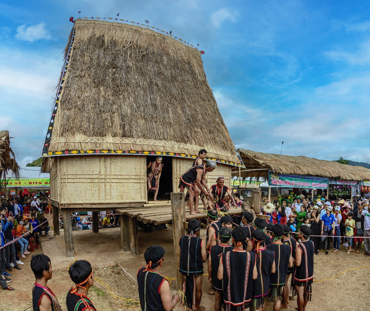 Dưới sân nhà rông, mỗi hộ gia đình gùi 1 ghè rượu được ủ từ gạo mới, cơm lúa mới được bày ra xếp xung quanh cây nêu. Bà con chờ già làng Húc khai ghè rượu trước và lần lượt chia sẻ niềm vui cùng nhau. Các bà, các mẹ chia cho những em bé từng ống cơm mới thơm lừng. Những đôi trai gái bắt đầu kéo tay mời rượu, vẫy gọi nhập vòng xoang hòa cùng âm thanh cồng chiêng như thứ men say bất tận. Các chàng trai thân mình rắn chắc ngước tìm đối thủ để bắt cặp thi đấu vật, đẩy gậy, đi cà kheo… Tất cả hòa chung không khí rộn ràng, vui tươi trong lễ hội lớn của buôn làng.