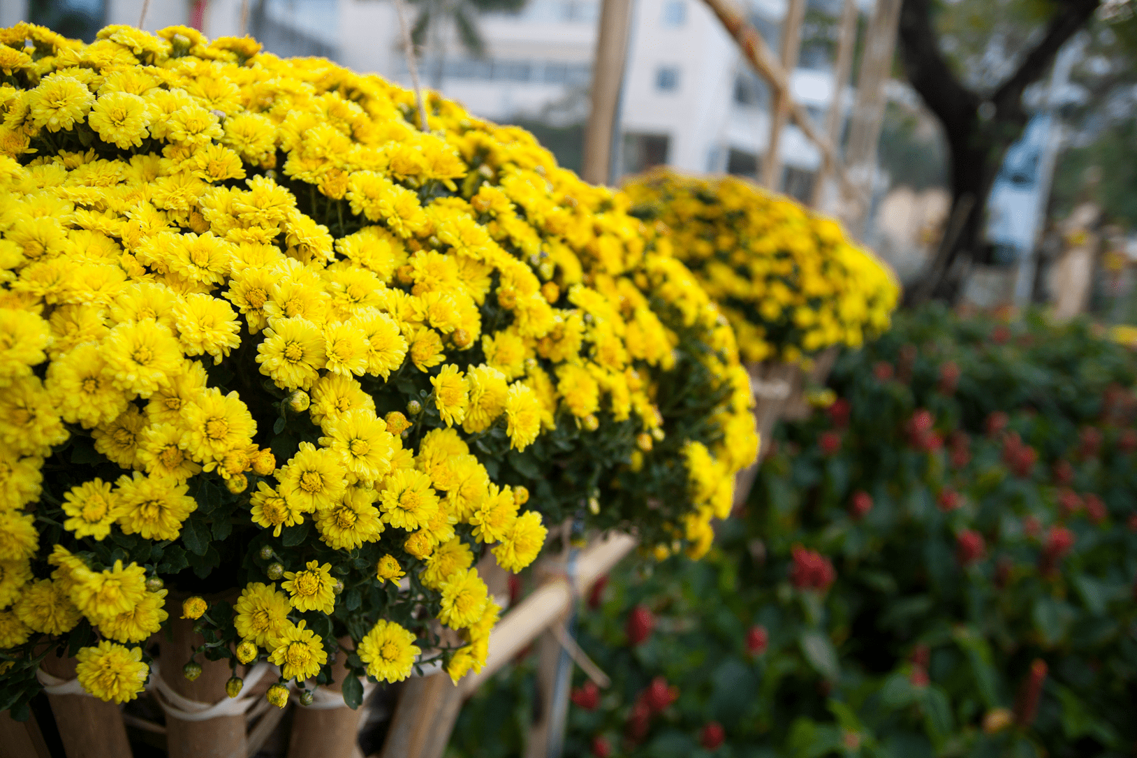 Đường Nguyễn huệ ở trung tâm Sài Gòn đột nhiên ngừng mọi hoạt động để dành chỗ cho hội hoa xuân hàng năm dài tới 1km, với khoảng 100.000 chậu hoa xếp hàng tạo thành hành lang hoa lộng lẫy. Tuy thế, có hai màu chủ đạo thường thấy trong dịp Tết là màu đỏ và màu vàng. Màu đỏ tượng trưng cho an lành và hơi ấm, với hoa cúc đỏ, hồng thắm hay hoa trạng nguyên. Màu vàng, màu của kim tiền, bừng nở với những cúc đại đóa, vạn thọ, hướng dương, và đặc biệt là cánh mai vàng tươi mới của đất trời phương Nam.