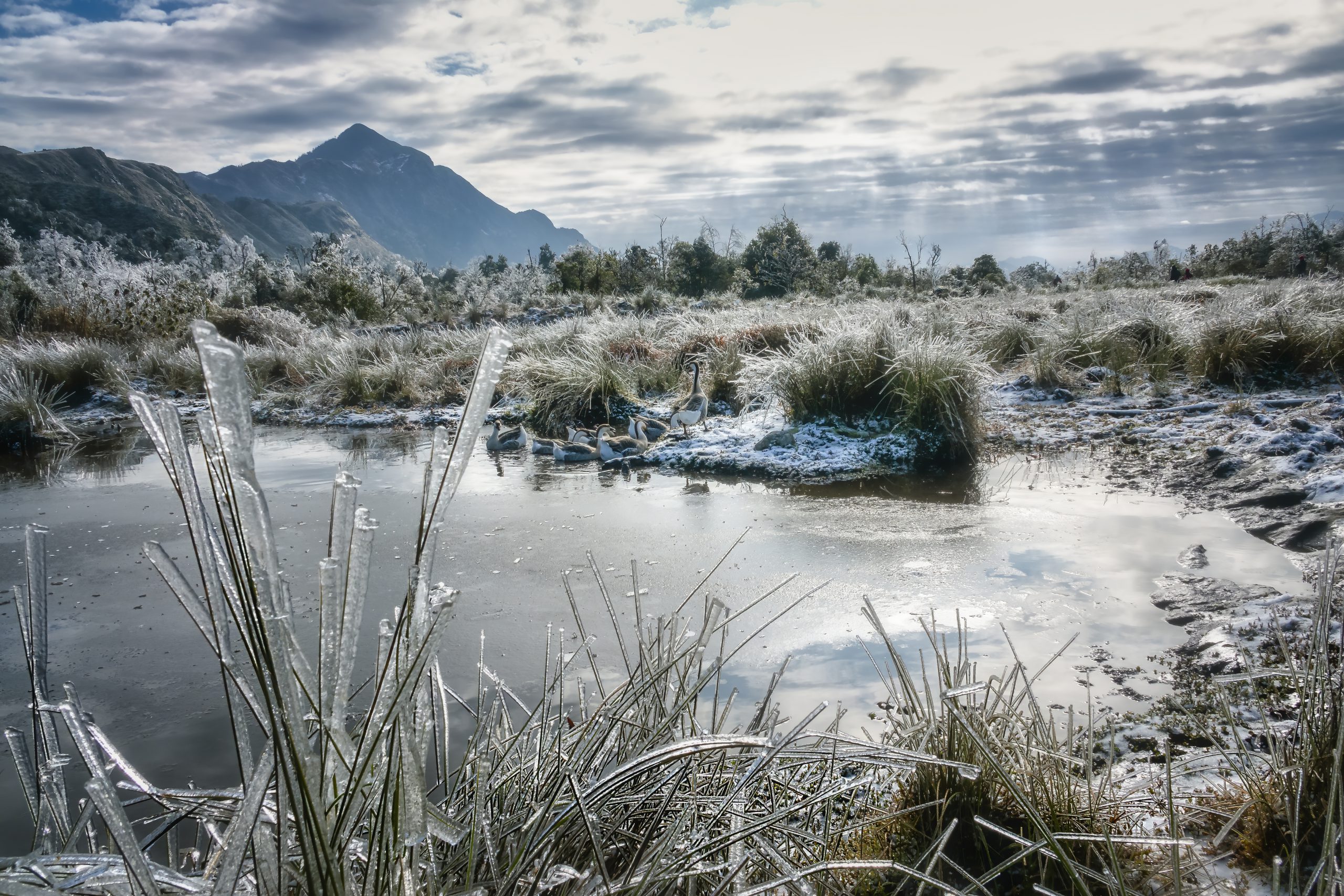 Tôi đeo máy ảnh, men theo con đường mòn trơn trượt leo lên sườn núi cao. Từ đây có thể ngắm nhìn toàn cảnh bản Nhìu Cù San trong tuyết trắng giống như một ngôi làng cổ tích. Cạnh bản, cây cối phủ đầy băng nhìn như một cánh rừng toàn những cây làm bằng thủy tinh trong suốt. Mỗi khi có ánh sáng xuyên qua, cả cánh rừng trở nên lấp lánh…