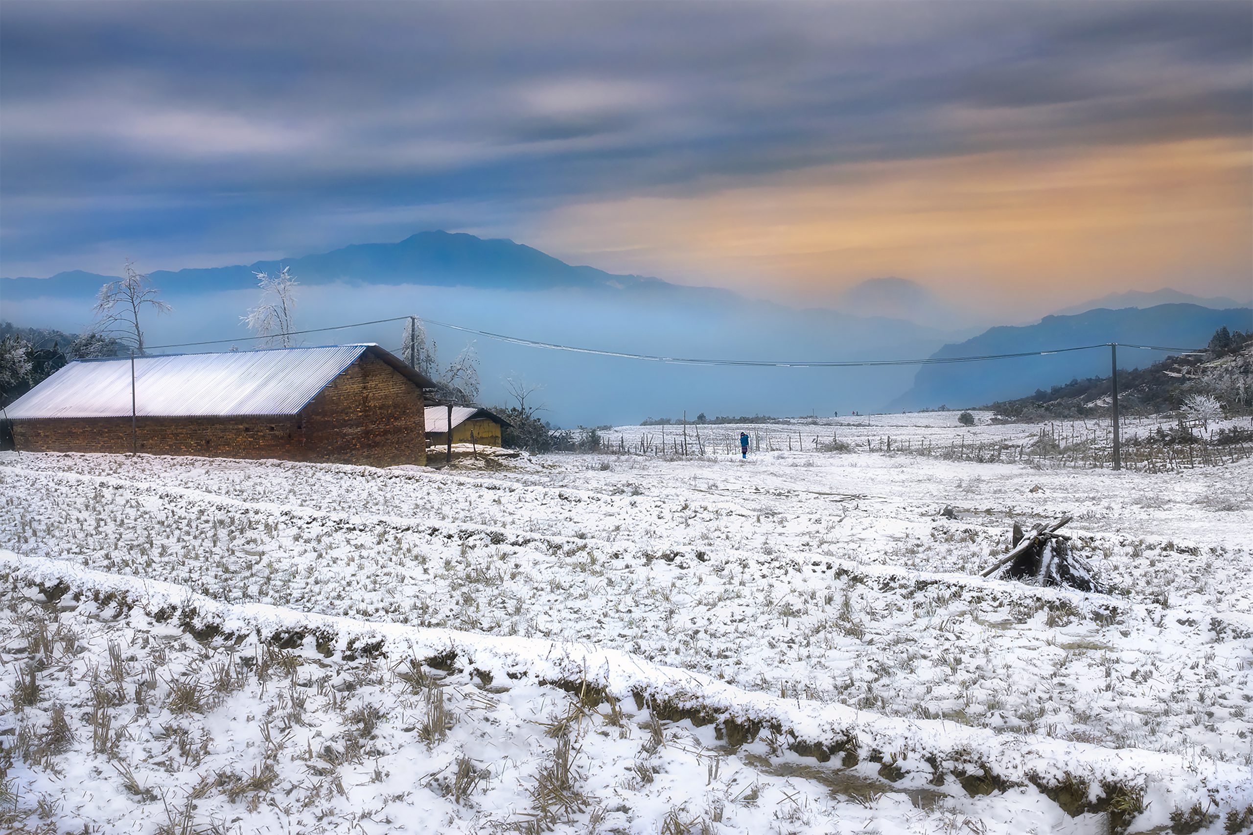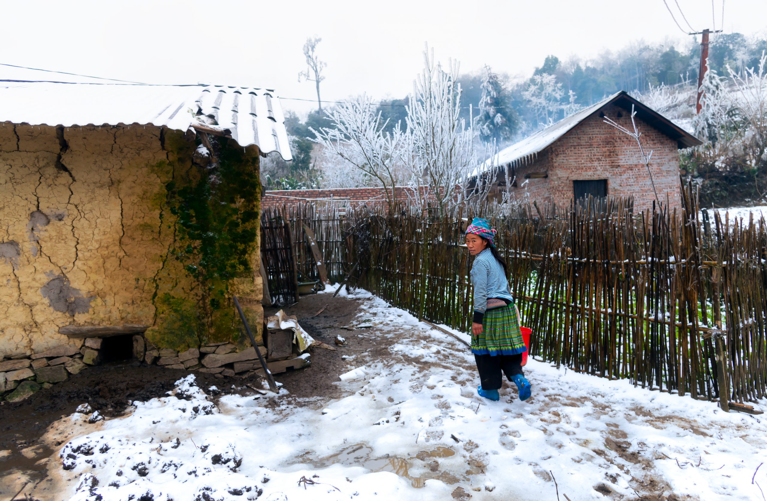 Mùa đông đến, khi những cơn gió lạnh hun hút tràn xuống từ phương Bắc, mang theo cái giá rét buốt lạnh tới thấu xương cũng là lúc khả năng có tuyết rơi. Nơi này cùng với Sa Pa, là những địa điểm hiếm hoi ở Việt Nam thỉnh thoảng xuất hiện tuyết. Chúng tôi tới bản nhỏ vào một ngày mùa đông lạnh nhất. Năm đó, tuyết đã rơi suốt đêm. Nhiệt độ ngoài trời lạnh đến nỗi máy ảnh và các thiết bị điện tử đều không thể hoạt động. Chúng tôi phải dùng khăn len bọc máy ảnh lại, sưởi ấm cho máy ảnh, rất lâu sau mới có thể khởi động để bắt đầu công việc.