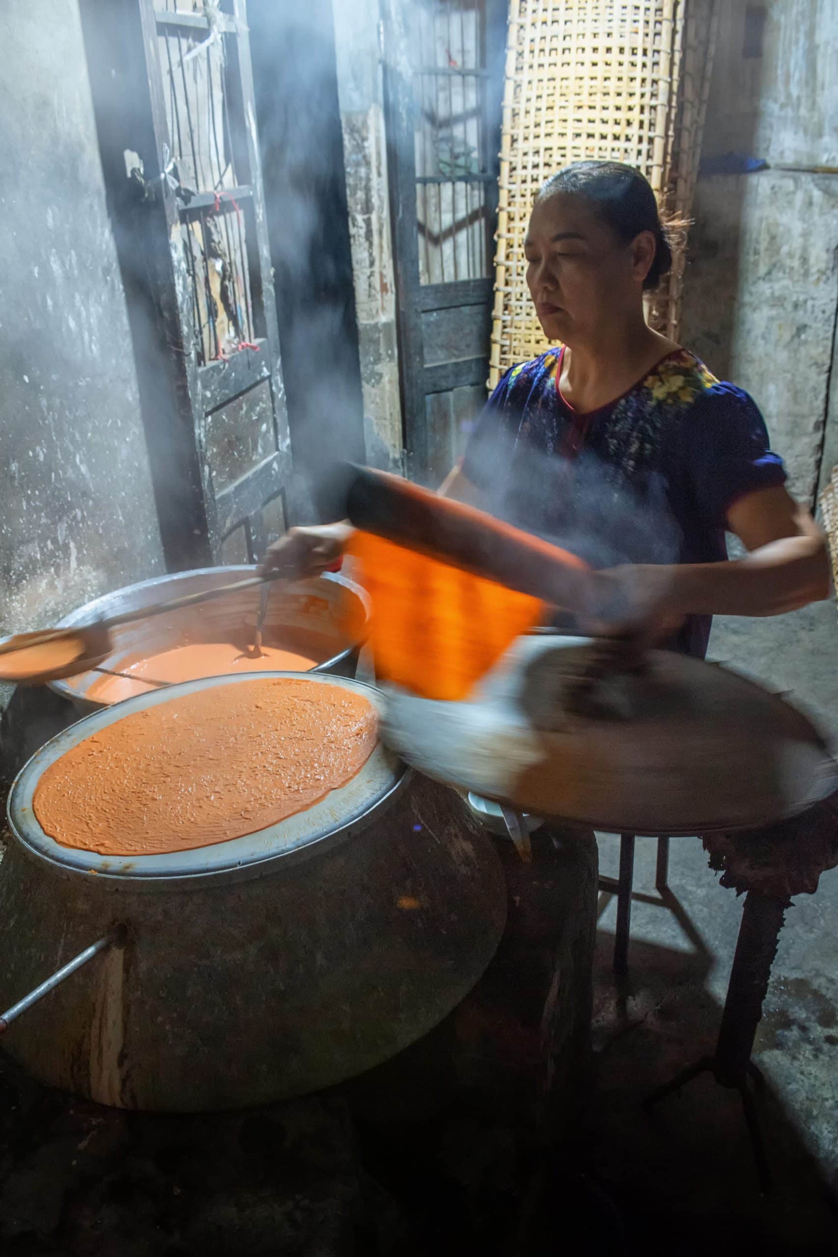 Bột gạo sau khi lọc được cho vào cối đá trộn nhuyễn cùng thịt gấc, sợi dừa. Sau hàng giờ, hỗn hợp bột màu cam dai, mịn được tạo thành, phục vụ cho khâu tráng bánh. Chị Ngọc – vợ anh Khánh thoăn thoắt cán bột trên khuôn. Lúc này, bột được dàn mỏng trên mặt toan căng trên miệng nồi, chín bằng hơi nước như người ta làm bánh cuốn. Bánh đa có đường kính lớn hơn, tròn tăm tắp. Chị rắc đều vừng, lạc, dừa lên mặt bánh, sau đó cho bột vào láng đều, khoảng 1-2 phút mở vung ra, lúc này bánh đã chín. Cuối cùng, chị Ngọc dùng ống nứa nhấc bánh đặt trải đều trên mành (khay) tre. Cứ 5 chiếc bánh là vừa vặn một khay, chính xác từng giây, tay đều nhịp nhàng. Anh Khánh mang bánh đi phơi ngay lúc đó. Khi mặt trời lên, lập tức cả khoảng sân nhà đã có vô vàn mặt trời đỏ rực còn vương mùi khói.