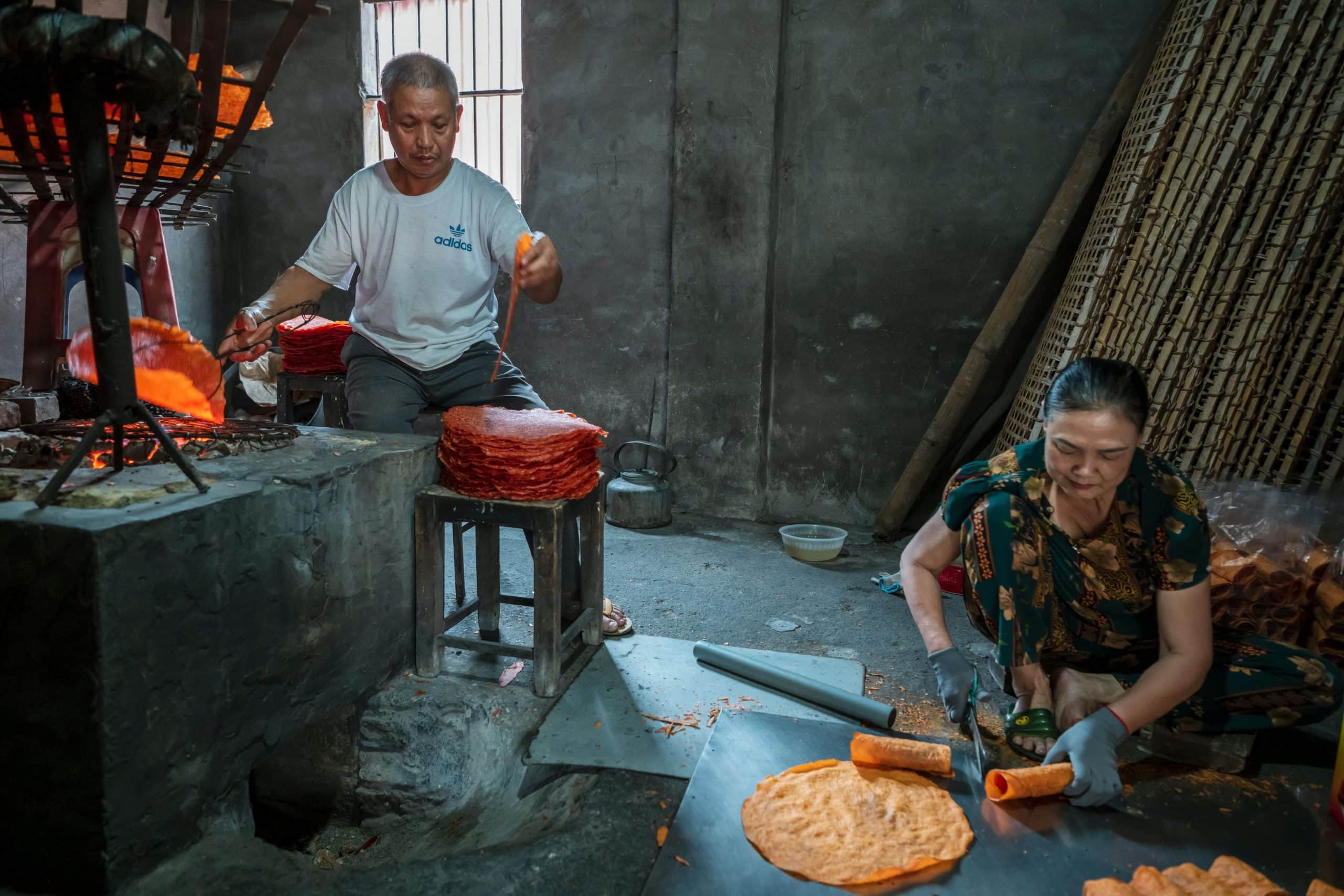 Công đoạn phơi bánh đòi hỏi phải có kinh nghiệm, phơi 2 hoặc 3 nắng để đủ độ khô, đảm bảo khi nướng lên sẽ giòn, xốp, nở bột đều. Bánh được nướng trên lò than. Việc “canh than” sao cho bánh có thể chín đều cũng dựa vào bàn tay người thợ. Bánh hơ trên than hồng, người thợ vừa nướng vừa cuộn bánh theo chữ nhật hay cuộn tròn theo ý thích. Thường phải có 2 người cùng làm thì lúc gấp bánh mới được như ý, bởi chỉ nhấc bánh ra khỏi than hồng chừng 1 phút, bánh đã khô giòn.