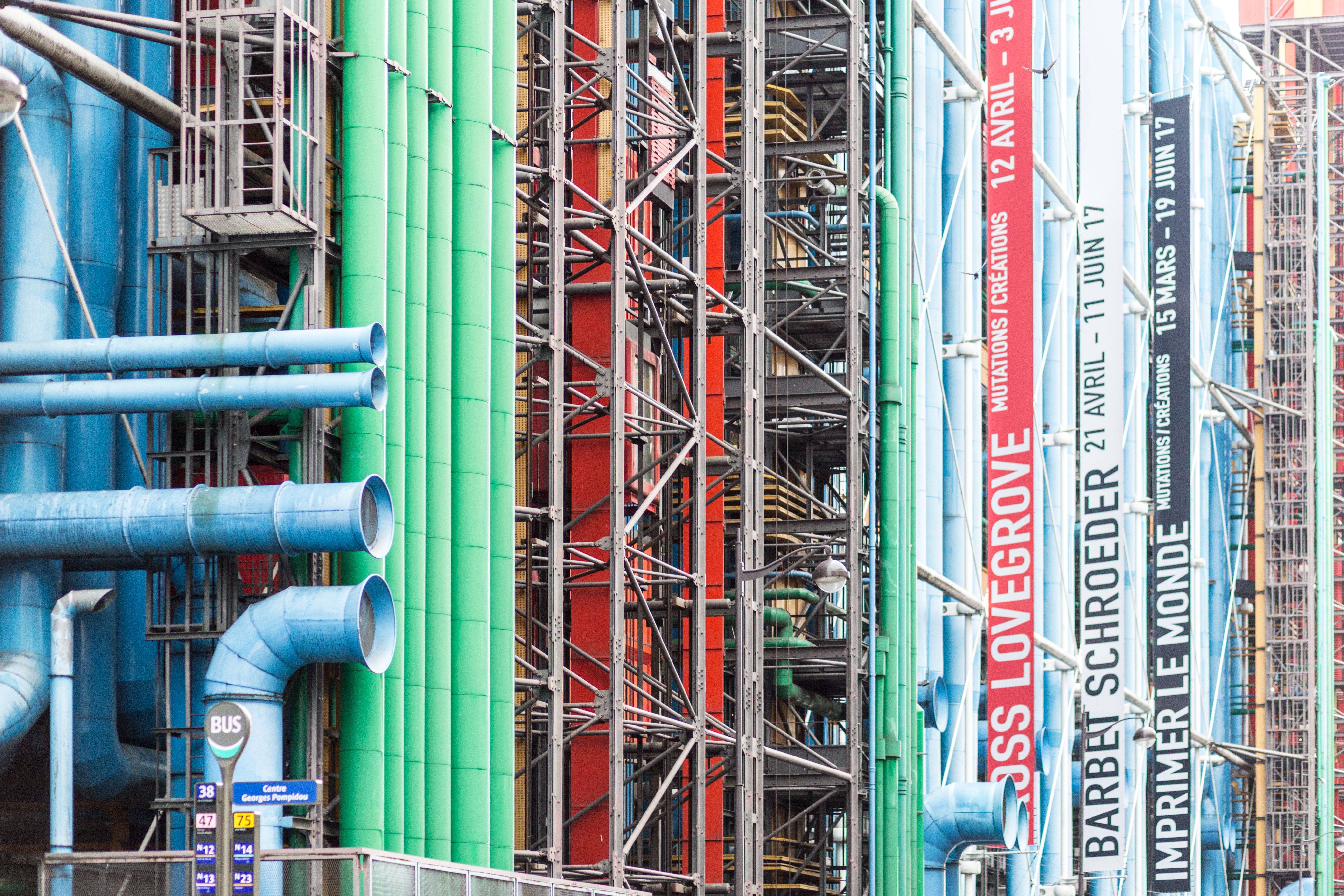 Tác giả bản thiết kế là hai kiến trúc sư nổi tiếng Renzo Piano và Richard Rogers, những người đã tạo ra một phong cách kiến trúc phô bày kết cấu và sử dụng các vật liệu hiện đại như kính, thép và các chất liệu công nghiệp khác. Tòa nhà chính có 8 tầng và 2 tầng hầm, diện tích sàn mỗi tầng 7.500m², nổi bật giữa cảnh quan trung tâm Paris nhờ dáng vẻ “công nghiệp” khi dùng một thủ pháp “lộn trái”: đưa các ống, cột và hệ thống cầu thang ra mặt tiền. Các hệ ống được sơn màu theo chức năng, như các ống điều hòa có màu xanh da trời, các ống nước có màu xanh lá cây còn các đường ống điện có màu vàng, hệ thống thang được đặt trong một ống màu đỏ còn các ống màu trắng là hệ thống thông gió của tầng ngầm.