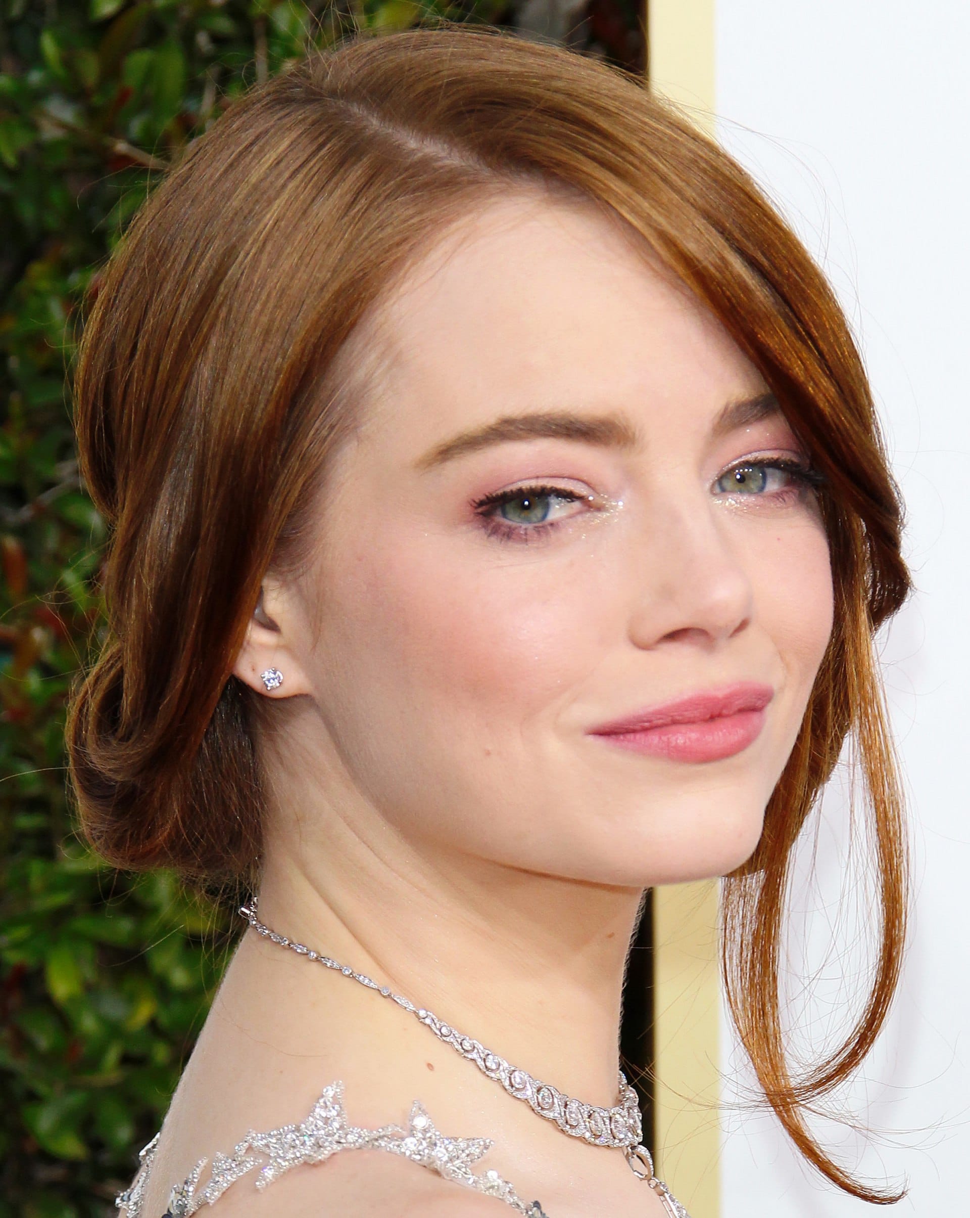 Nữ diễn viên có mái tóc màu hạt dẻ này luôn chọn tông trang điểm nhẹ nhàng, làm tôn nước da trắng mịn và những đường nét tươi trẻ trên gương mặt. Để tạo điểm nhấn cho búi tóc trễ tràng và phong cách trang điểm nhẹ nhàng, Emma chọn trang phục rực rỡ hoặc trang sức ấn tượng, như chiếc vòng cổ đính kim cương lộng lẫy tại lễ trao giải Quả cầu vàng năm nay.