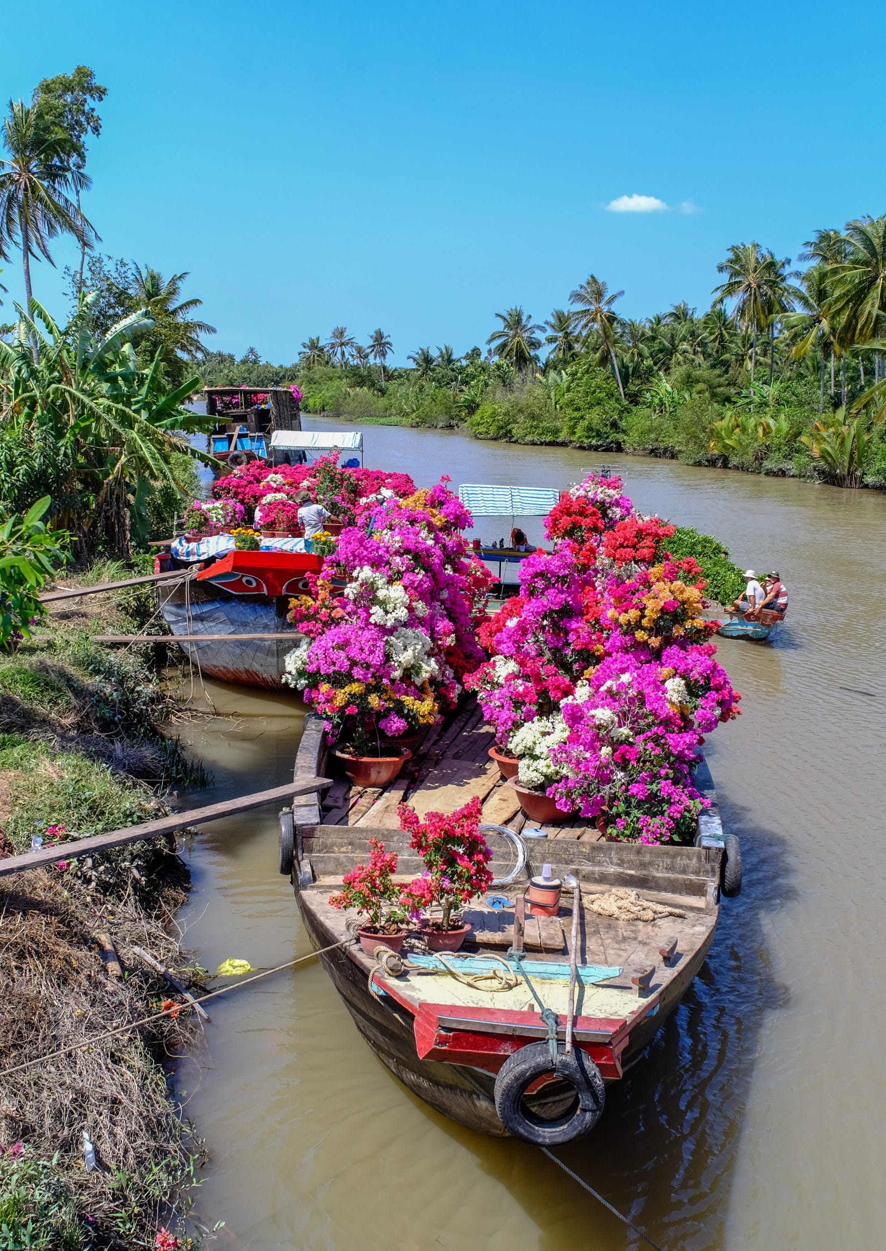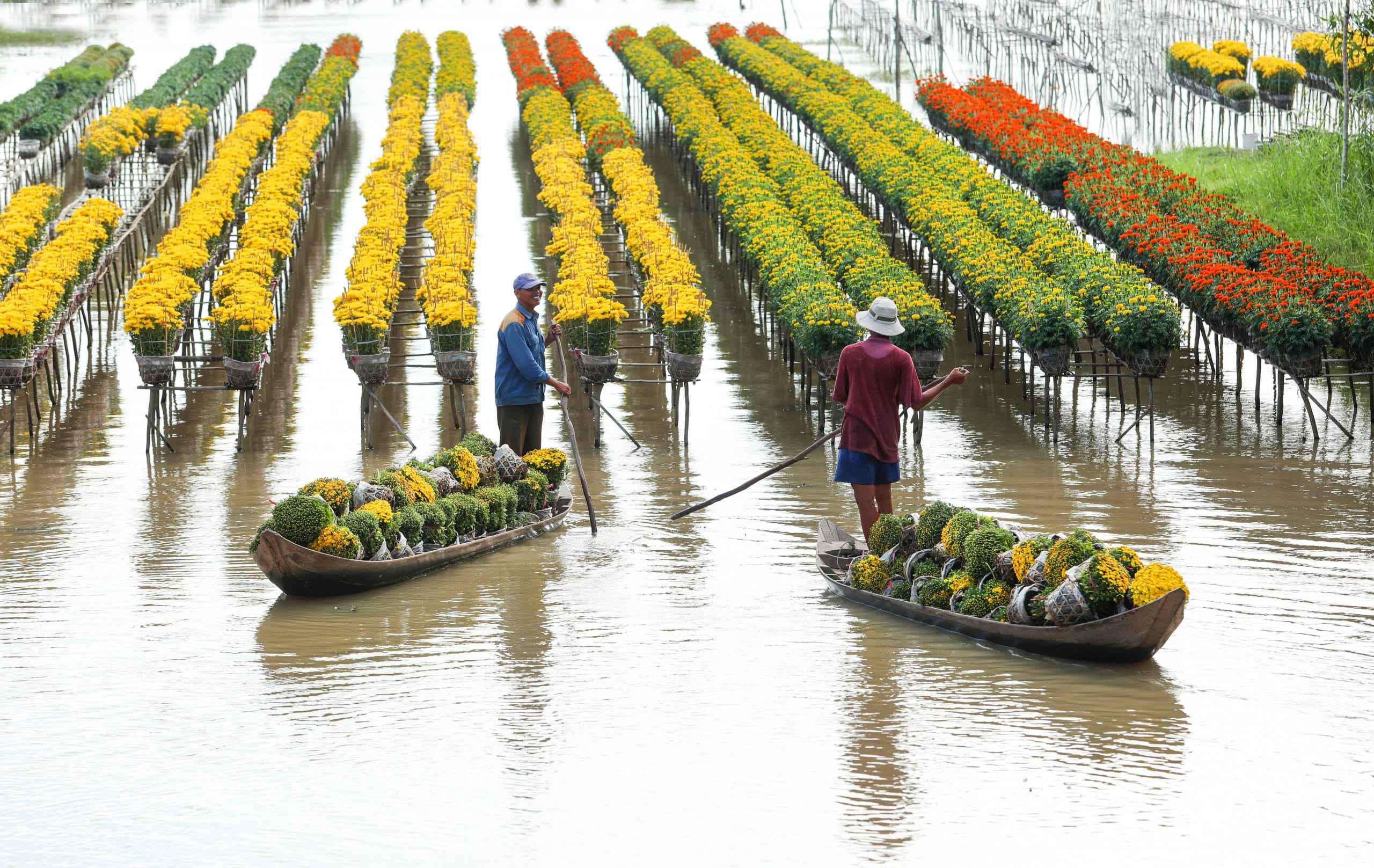 Bắt đầu từ khoảng 23 tháng Chạp – ngày tiễn ông Táo về trời, các chợ hoa hoạt động hầu như xuyên đêm. Hoa đủ loại từ cúc vạn thọ, mào gà, đồng tiền, hoa giấy, thược dược, mâm xôi… được chở bằng đủ các loại thuyền bè, dập dềnh trên sóng nước Cửu Long.