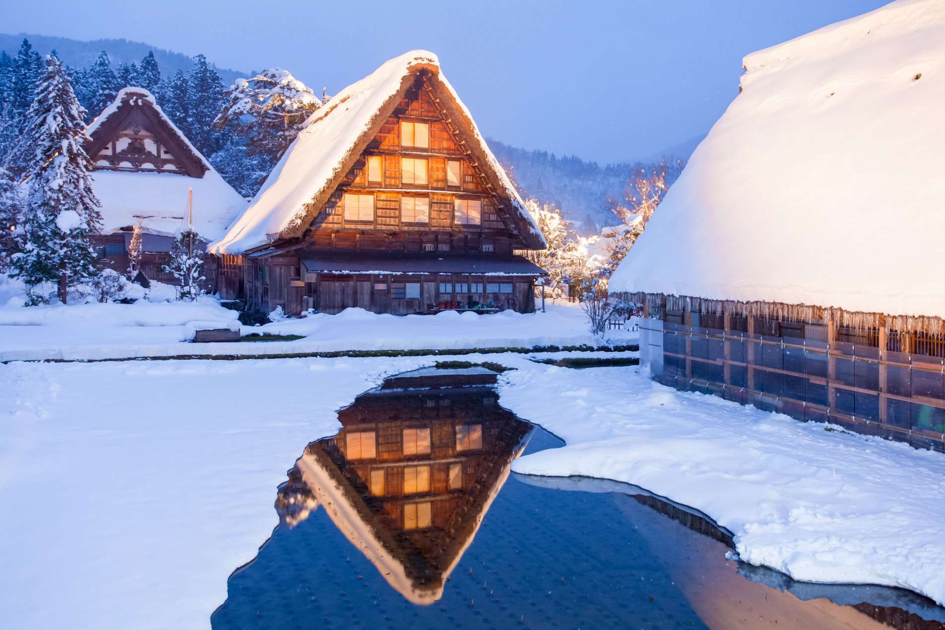 Ngày quay lại Shirakawa-go, ngôi làng đã khoác một chiếc áo trắng muốt khiến tôi vừa thấy thân quen vừa thấy lạ lẫm. Những ngôi nhà nhỏ xinh đã ngập trong tuyết trắng, những mái tranh cỏ khô dày dặn đã thực sự phát huy tác dụng khi tuyết chỉ vương được một lớp mỏng đủ làm nên vẻ lãng mạn hiếm có. Nhiệt độ trung bình tại Shirakawa-go vào mùa đông là dưới 0 độ C, cũng là một trong những nơi tuyết rơi nhiều nhất thế giới. Từ con đường dẫn vào làng đến những lối nhỏ trồng đầy hoa tím mà tôi từng thương nhớ trong chuyến đi mùa thu nay đã ngập tuyết trắng. Tôi lang thang quanh làng, lúc dừng chân nặn tuyết hay chơi ném tuyết với những người bạn đồng hành, khi ghé tiệm bán đồ lưu niệm xinh xắn rồi cùng nhau nhâm nhi tách trà trước khi bắt đầu leo lên đài quan sát. Lịch lên đèn trong những ngày diễn ra lễ hội được ấn định từ trước và những người có vé lên đài quan sát trong 500 suất cần phải có mặt ở đây trước giờ đèn sáng. Và thời khắc diệu kì cũng đã đến, những bóng đèn vàng rực sáng đồng loạt biến cả ngôi làng thành xứ sở thần tiên. Cảnh tượng lung linh trước mắt tôi không khác gì tấm bưu thiếp Giáng sinh vẫn thường thấy với trăm ngàn bông tuyết lấp lánh rơi đều xuống những mái nhà được thắp sáng bởi ánh đèn vàng ấm áp. Không phải là tôi đang mơ khi được chạm vào thế giới cổ tích này. Shirakawa-go đã cho tôi có những giây phút ngọt ngào ở chốn huyền ảo giữa đời thực bình yên.
