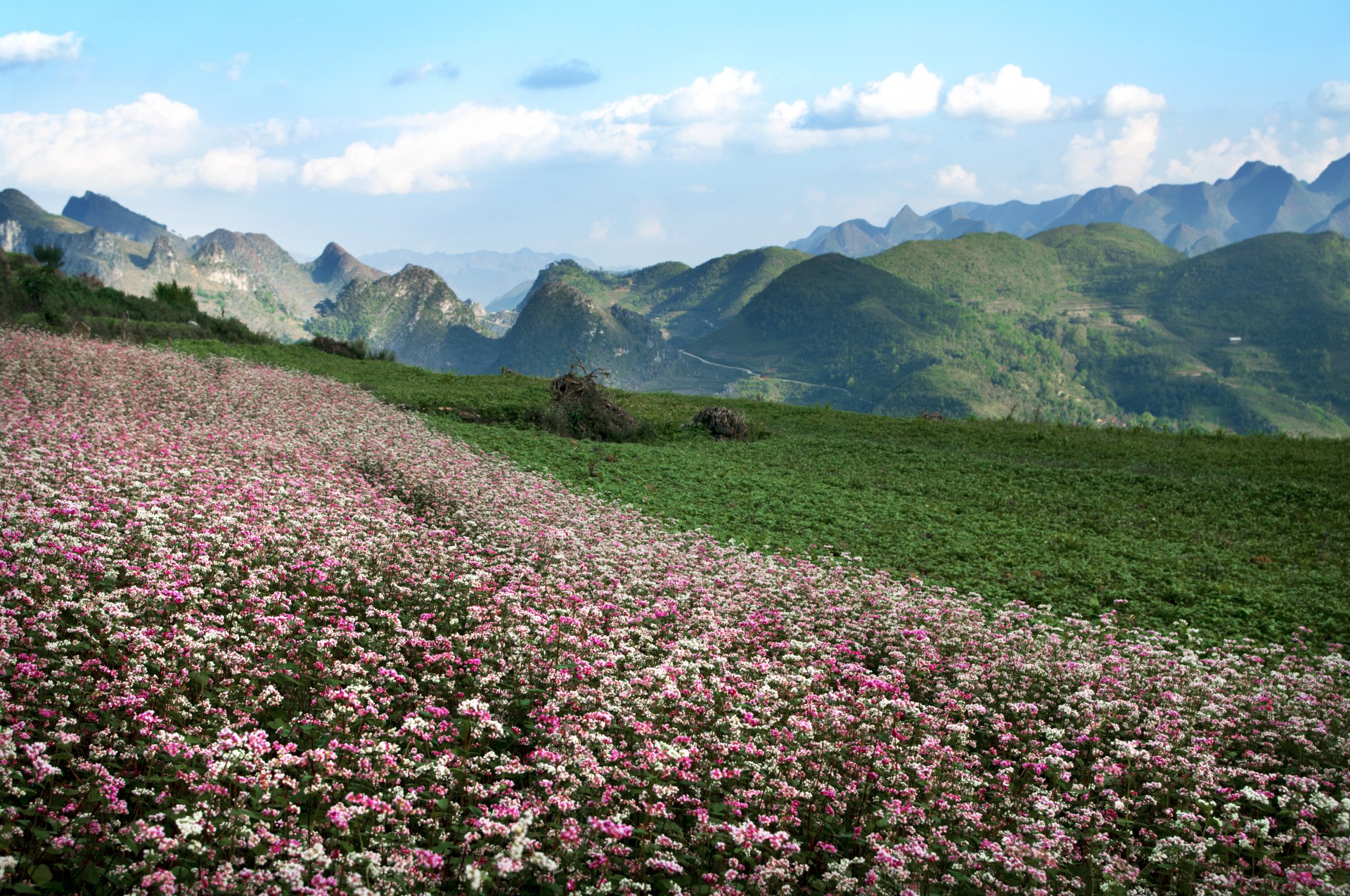 Hoa tam giác mạch nở rộ đẹp nhất vào độ thu tàn cuối tháng 10 đầu tháng 11. Loài hoa này có 3 màu trắng, hồng và tím. Tên hoa giản dị như hình hài của nó, ba cánh hoa chụm lại hình chóp nón và ở giữa là một hạt mạch. Mùa hoa này gợi hình ảnh mộng mơ về những vạt hoa như những dải khăn lụa mềm mại vắt hờ hững trên những triền núi. Những “phượt thủ” thường chọn Hà Giang để ngắm hoa tam giác mạch với gam màu chủ đạo là hồng và tím. Cuối tháng 10, Hà Giang bắt đầu chuyển lạnh nhưng cao nguyên đá tai mèo không hề u ám bởi đã có những triền núi phủ đầy hoa điểm xuyết vào bức tranh hùng vĩ. Từ Quản Bạ đến Đồng Văn và vòng theo dòng Nho Quế, uốn lượn theo những cung đường ngoằn ngoèo để vượt đèo Mã Pí Lèng sang tận Mèo Vạc, hoa tam giác mạch đua nở khắp các nẻo đường. Người dân Hà Giang vốn trồng loại này để làm cây lương thực. Nhận thấy ngày càng nhiều người ưa thích du lịch về đây vào mùa hoa này, những người nông dân đã thu phí dịch vụ theo kiểu tự phát và bước đầu quy hoạch những diện tích trồng cây phục vụ du lịch.