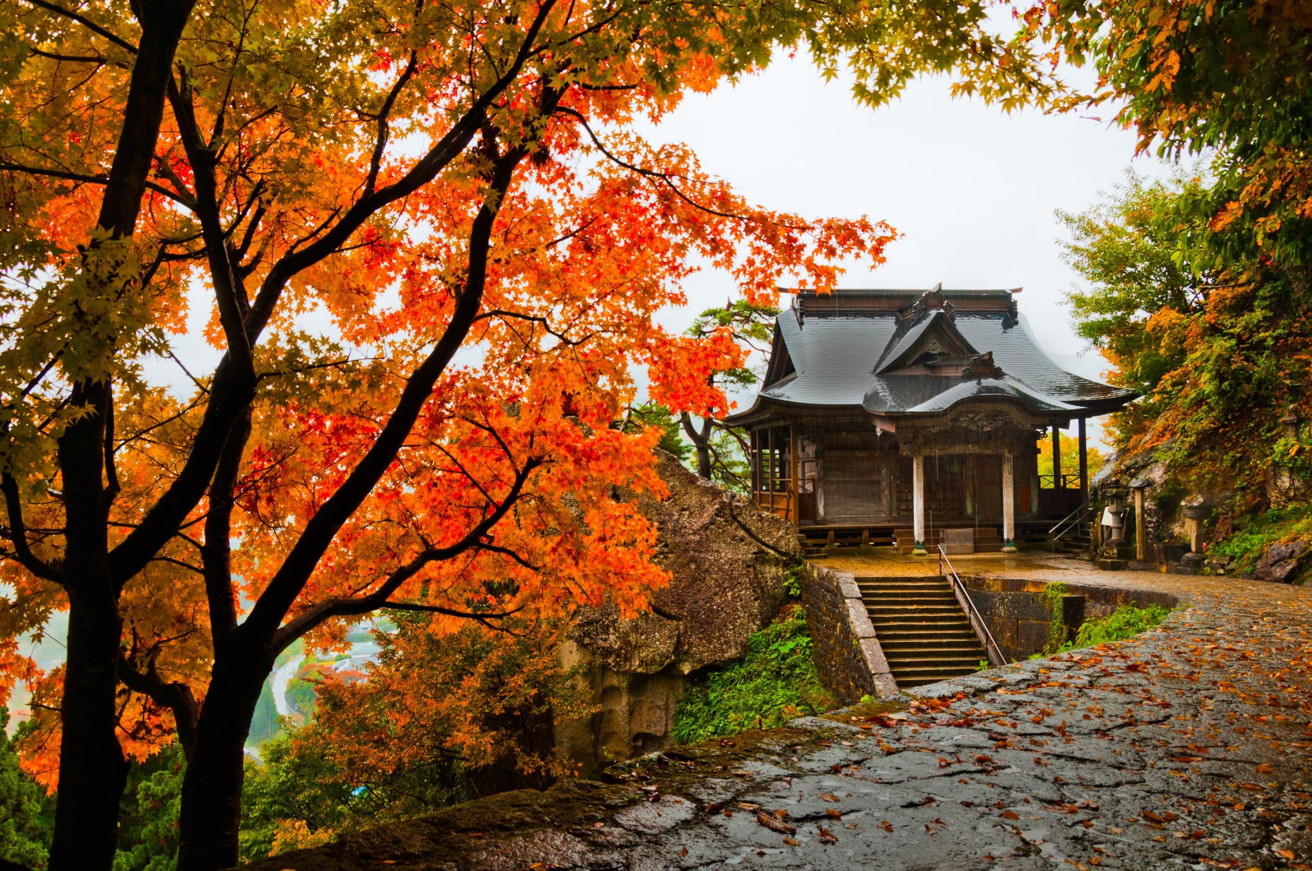Mùa thu còn được gọi là mùa momiji ở Nhật tức là khi các cây phong chuyển lá đỏ rực rỡ. Khắp đất nước mặt trời mọc cây lá chuyển màu đẹp tựa chốn thần tiên. Và trong khung cảnh ấy, những di tích đền chùa càng trở nên nổi bật trên nền cây lá. Con đường lên núi Houju với hơn 1.000 bậc thang dẫn tới đền Yamadera thuộc tỉnh Yamagata khi thu sang trở nên tấp nập vì du khách tới đây ngắm lá, ngắm cảnh dọc con đường với những cánh rừng vàng, đỏ nên thơ.