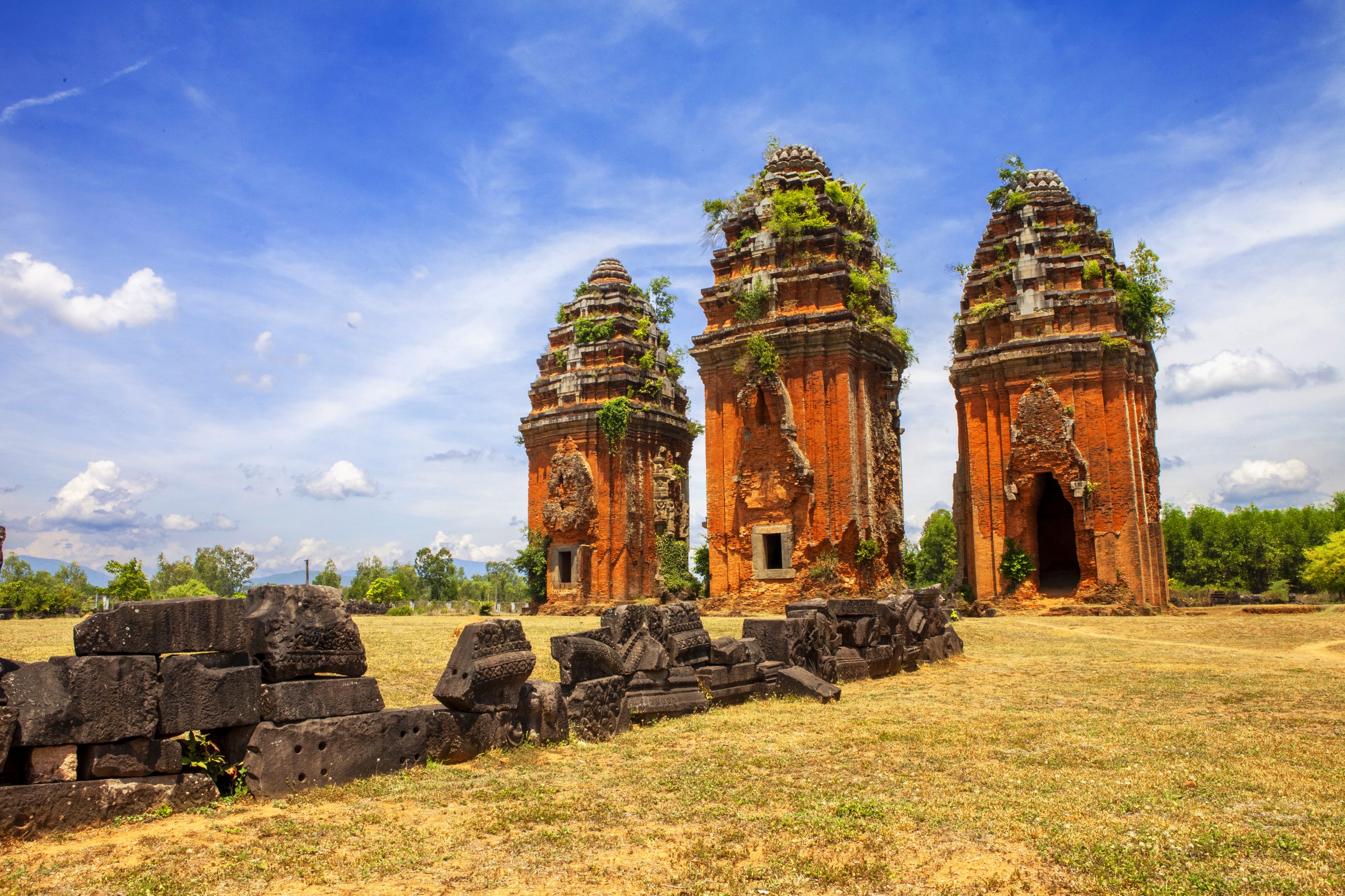 Đẹp và kì vĩ nhất là cụm tháp Dương Long, công trình 3 ngọn tháp thẳng hàng cao nhất Việt Nam, có vẻ tráng lệ, huy hoàng khó tin, đặc biệt gợi sự chú ý ở những mảng họa tiết đá nằm trên đỉnh của thân tháp xây bằng gạch. Họa tiết chạm đá quen thuộc ở đây là hoa dây, hình lửa, bánh xe luân hồi… những dấu ấn của Ấn Độ giáo vốn rải khắp một vùng Nam Á và lan tỏa tới tận bờ biển Thái Bình Dương.