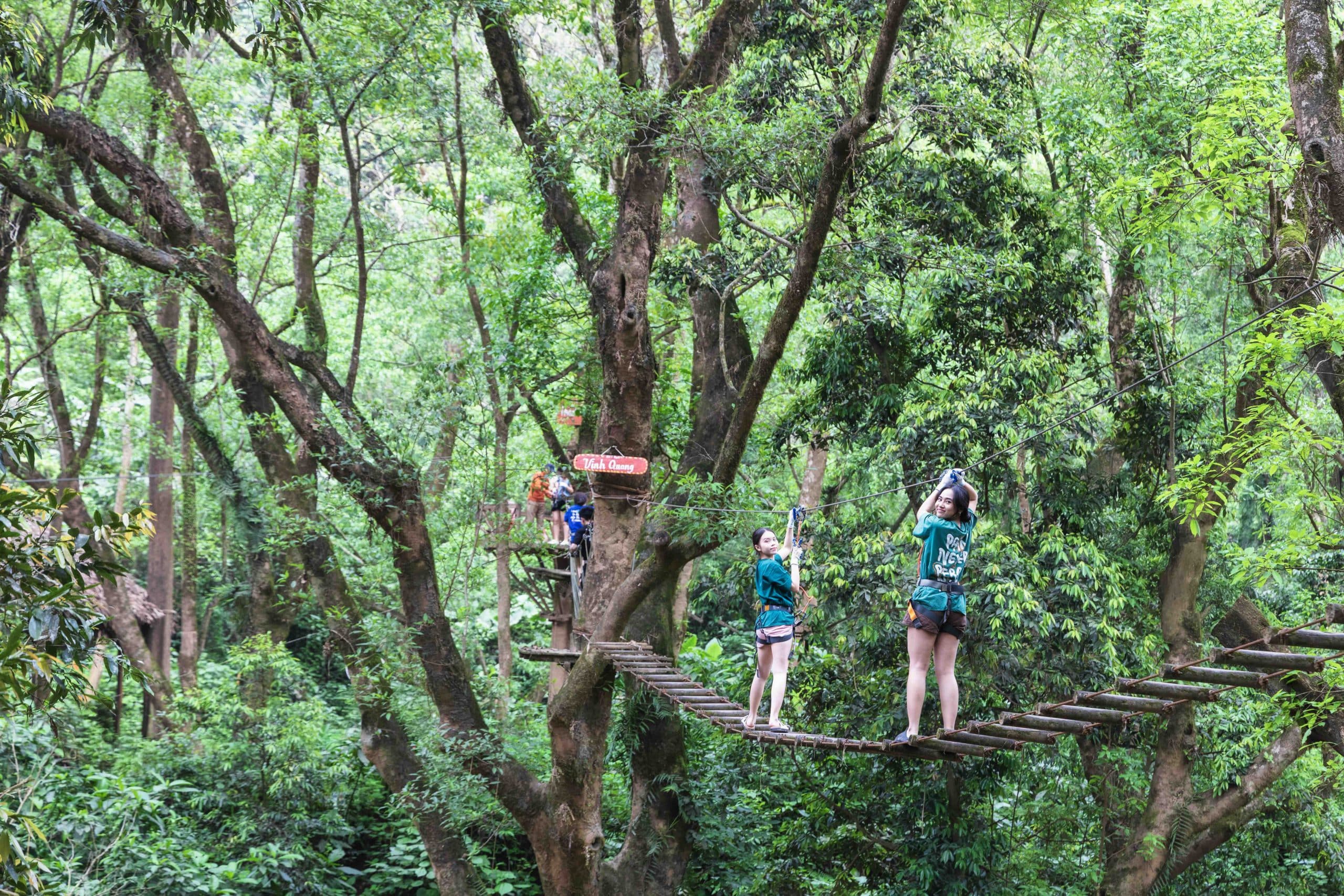 Với những tín đồ của du lịch trải nghiệm và ưa thích thử thách, công viên mang đến nhiều hoạt động như đi bộ xuyên rừng, chèo thuyền kayak trên dòng suối xanh mát hay thử làm Tarzan leo cây. Hệ thống cầu treo dài hơn 1km cho phép du khách đi xuyên rừng mà không xâm hại đến hệ sinh thái bên dưới. Không có những công trình đồ sộ hay dịch vụ xa hoa, nơi đây ghi dấu trong lòng du khách bằng một không gian bình yên với cỏ cây, đá, suối hoang sơ.