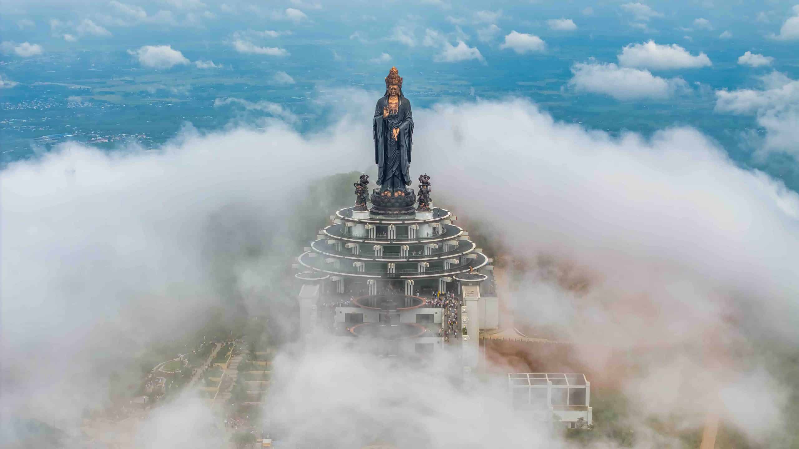 Có thời điểm, cả biển mây “tràn” qua đỉnh núi, bao phủ lên các công trình kiến trúc khiến không gian nơi đây trở nên huyền ảo. Mây dần tan, phóng tầm mắt nhìn ra xung quanh, dưới chân núi khung cảnh hiện ra như một bàn cờ khổng lồ với các ô nhỏ xanh mướt cây cối, hoặc vàng nâu của đất mới cày, hay lấp lánh tím của những tấm pin năng lượng mặt trời đan xen vào nhau một cách ngẫu nhiên mà tình tứ. Từ trên núi nhìn về phía đông theo hướng nhìn của Bồ Tát Di Lặc, xa xa sau cái “bàn cờ” ấy lấp loáng mặt nước xanh của hồ Dầu Tiếng – hồ nhân tạo lớn nhất Việt Nam và Đông Nam Á. Hồ Dầu Tiếng vừa là nguồn cung cấp nước cho nông nghiệp Tây Ninh và các tỉnh lân cận, vừa là nguồn thủy sản cho cư dân trong vùng và còn là điểm du lịch dã ngoại hấp dẫn của du khách yêu thiên nhiên gần xa.
