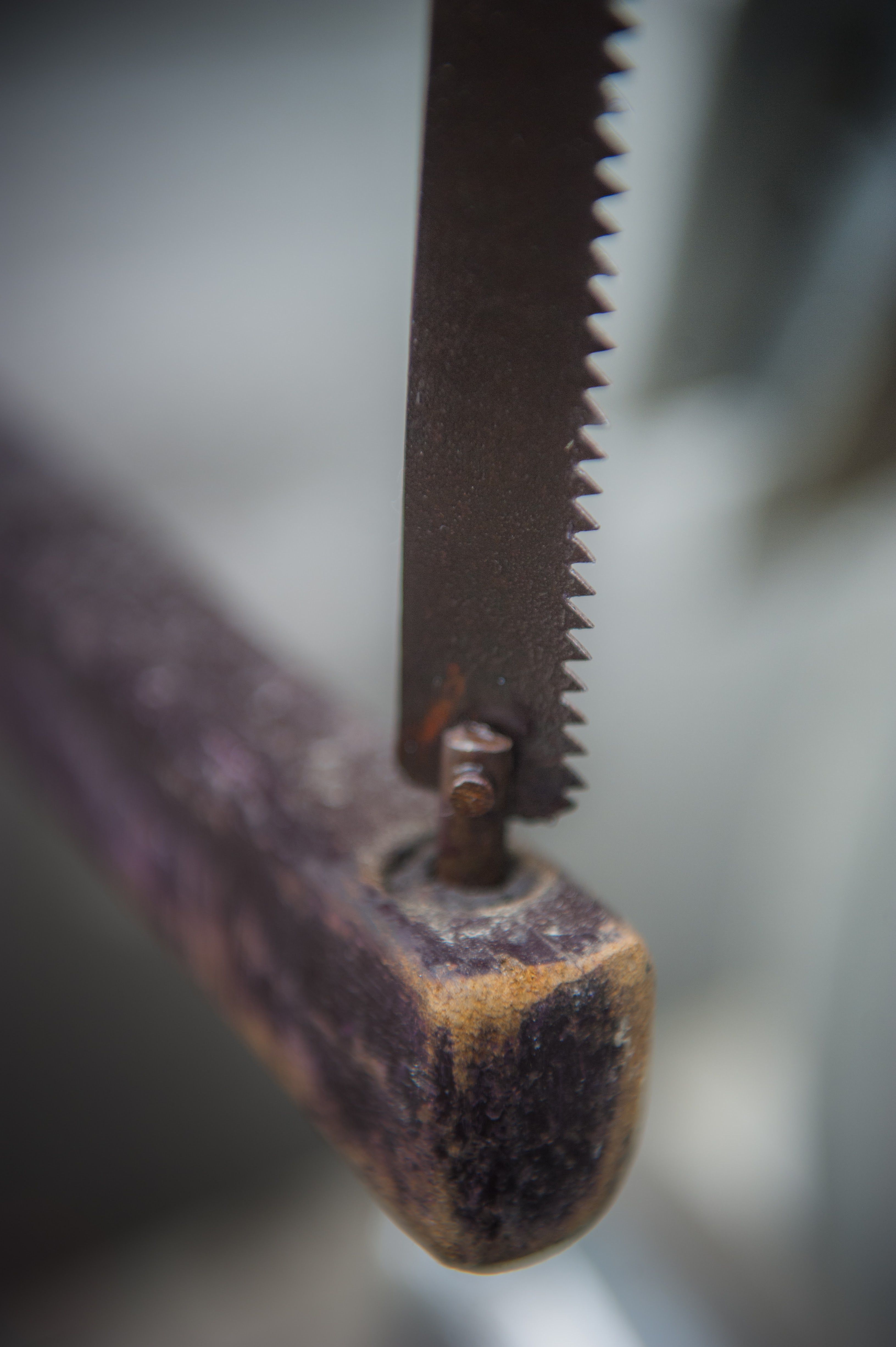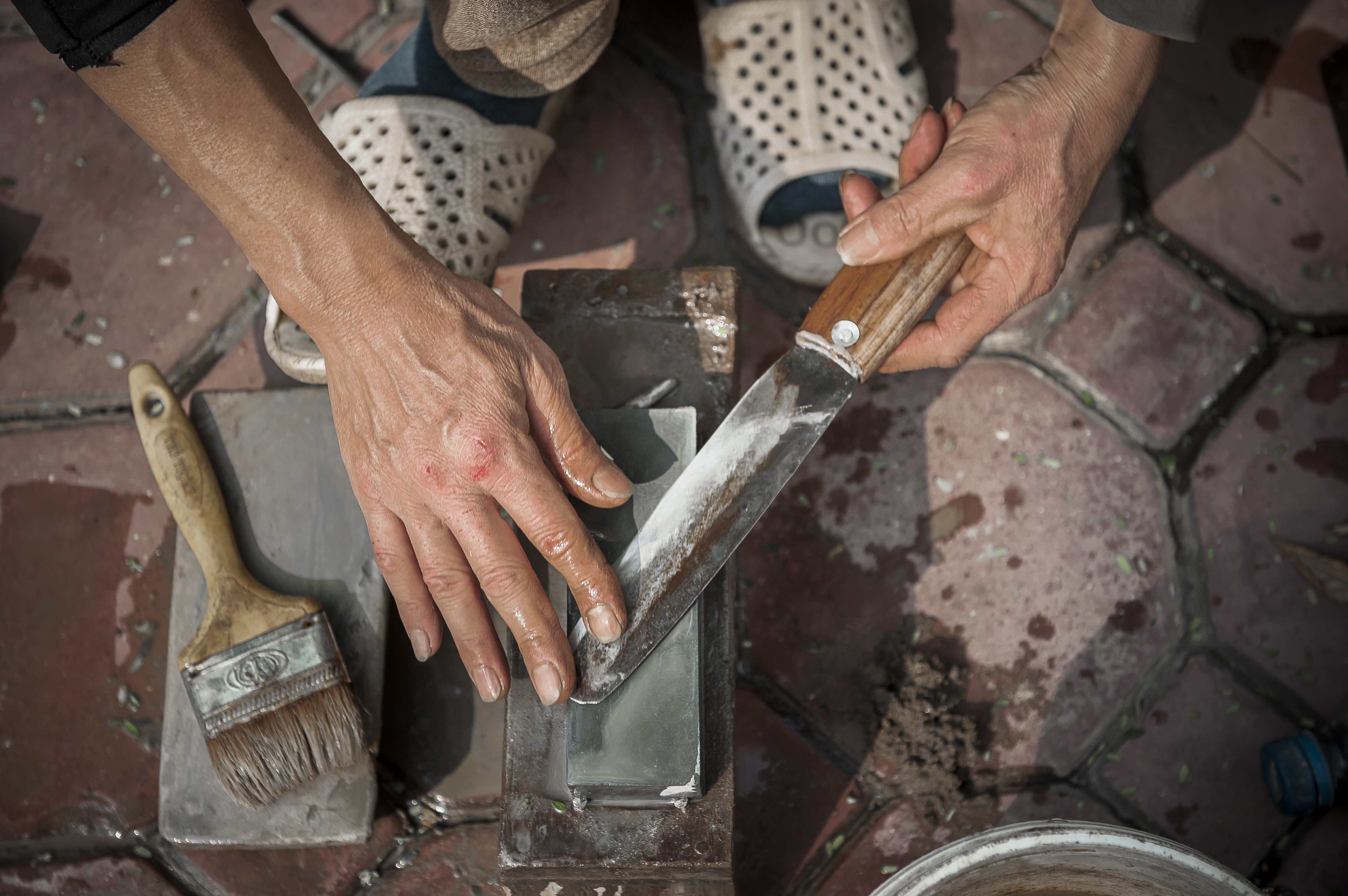 1. Chúng tôi ngồi bên nhau dưới những tàng cây thấp nơi góc phố Lý Thường Kiệt lưa thưa nắng. Từng ngày ấm tan dần theo sự chảy trôi của mùa, nên có chút nắng hiếm hoi là phải ra phố hong cho khô ảm đạm. Không phải lời rao trầm đều mà chính là tiếng quay kin kít từ vòng bánh xe mòn rạt của bác thợ mài dao đã kéo chúng tôi ra khỏi sự buồn tẻ. Thứ âm thanh vô tư ấy khiến con phố trở nên tươi tỉnh hơn giữa cái lạnh ngày đông. Nghe có tiếng gọi với từ một quán cơm nhỏ, bác thợ chao nhẹ ghi-đông và nhấc gọn chiếc xe lên vỉa hè. Bác vui vẻ nhận dao từ tay người phụ nữ trung niên rồi gỡ chiếc làn cũ phía sau yên xe xuống. Đồ nghề đơn giản chỉ có vài viên đá mài hình chữ nhật màu ghi xám, chổi sơn, chai đựng cát, khăn cũ, xô nước nhỏ cùng chiếc ghế gỗ đã nẻ đầy những nếp nhăn. Trước khi mài, bác kiểm tra tình trạng dao bằng đường miết tay rất mịn với cái nhìn chăm chú của một mắt thợ lành nghề. Lưng cong xuống, đầu gối ép sát ngực, mắt hồ như không chớp, con dao sau những đường lướt tay nhanh nhẹn đến khi lưỡi dao mỏng sáng lên, bác mới chịu dừng.