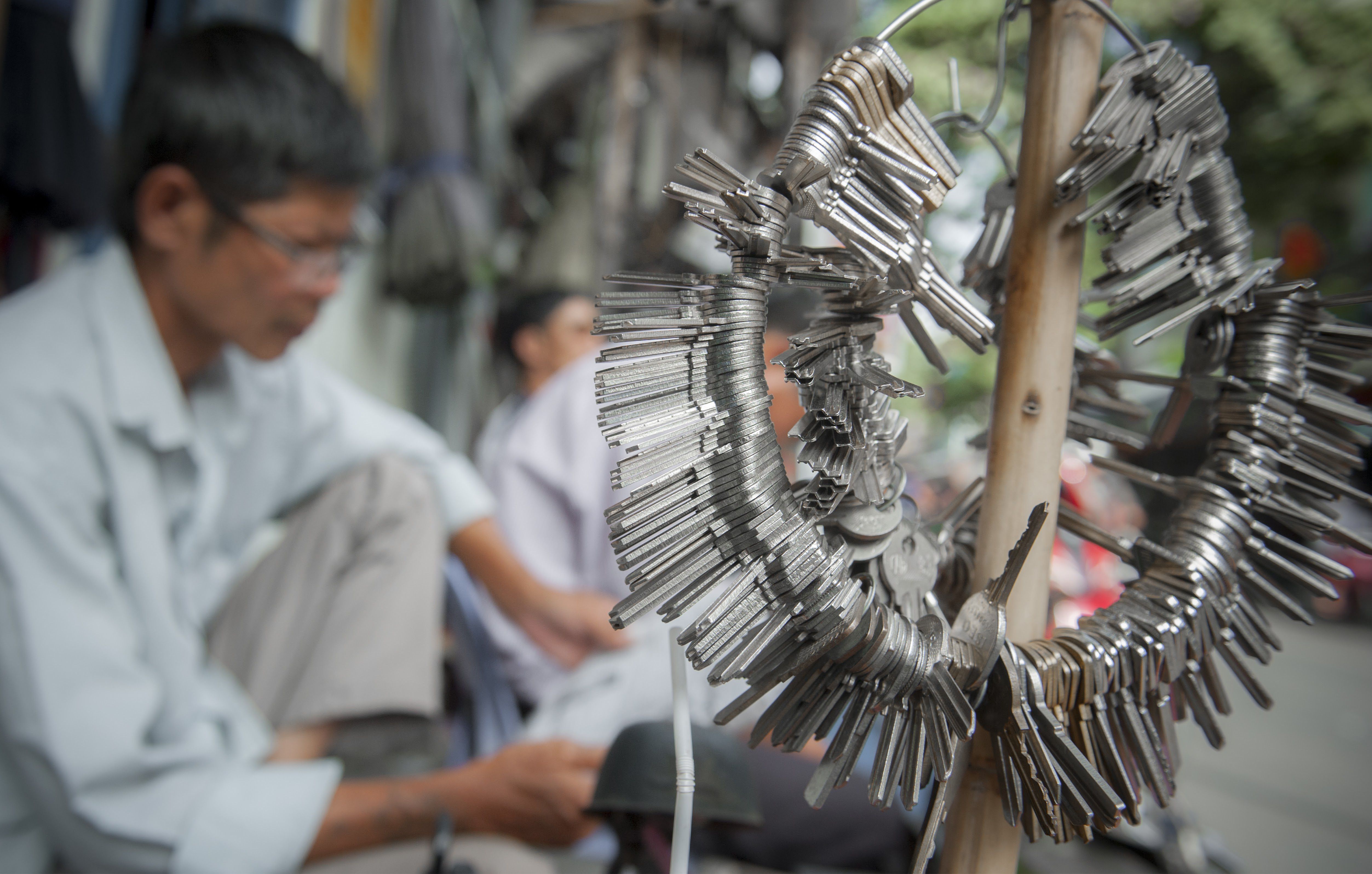 3. Lương Văn Can, một chiều ồn ã như bao chiều. Bác thợ khóa già tỉ mẩn mài từng chiếc khóa nhỏ. Tiếng rì rì của máy mài, tiếng sàn sạt của ngọn chìa miết trên đá cùng khói sắt và những tia nước ấm lẫn vào những náo nức còi xe. Ngón tay nắn nót, ánh nhìn thật sâu, để mỗi khía răng cưa lượn vào nhô ra của chìa phải chuẩn từng micromet. Chăm chú mài chìa tra khóa, chiếc kính lão cứ chễ xuống mũi để lộ nếp hằn sâu giữa hai chân mày bác thợ. Những vòng khóa treo trên chiếc cột tre kết vòng đều đặn, xòe ra như những bông hoa. Thật hơn, nó như chiếc vòng của cô gái vùng cao xuống hội đang tỏa ra trăm nhánh bạc đầy kiêu hãnh. Bác thợ khóa từng nói, với công việc này, kỹ năng chỉ là một phần, cần hơn là cái tâm trong nghề và sự nhạy bén để phân biệt được đâu là khách thật, đâu là kẻ xấu. Nên giữa lúc làm khóa, bác rất chịu khó trò chuyện với khách, một trong những cách khá tốt giúp bác suy xét. Lọt giữa các biển hiệu hào nhoáng hay đồ chơi rực rỡ sắc màu, góc khóa nhỏ của bác như một nét chấm phá rất riêng cho phố…