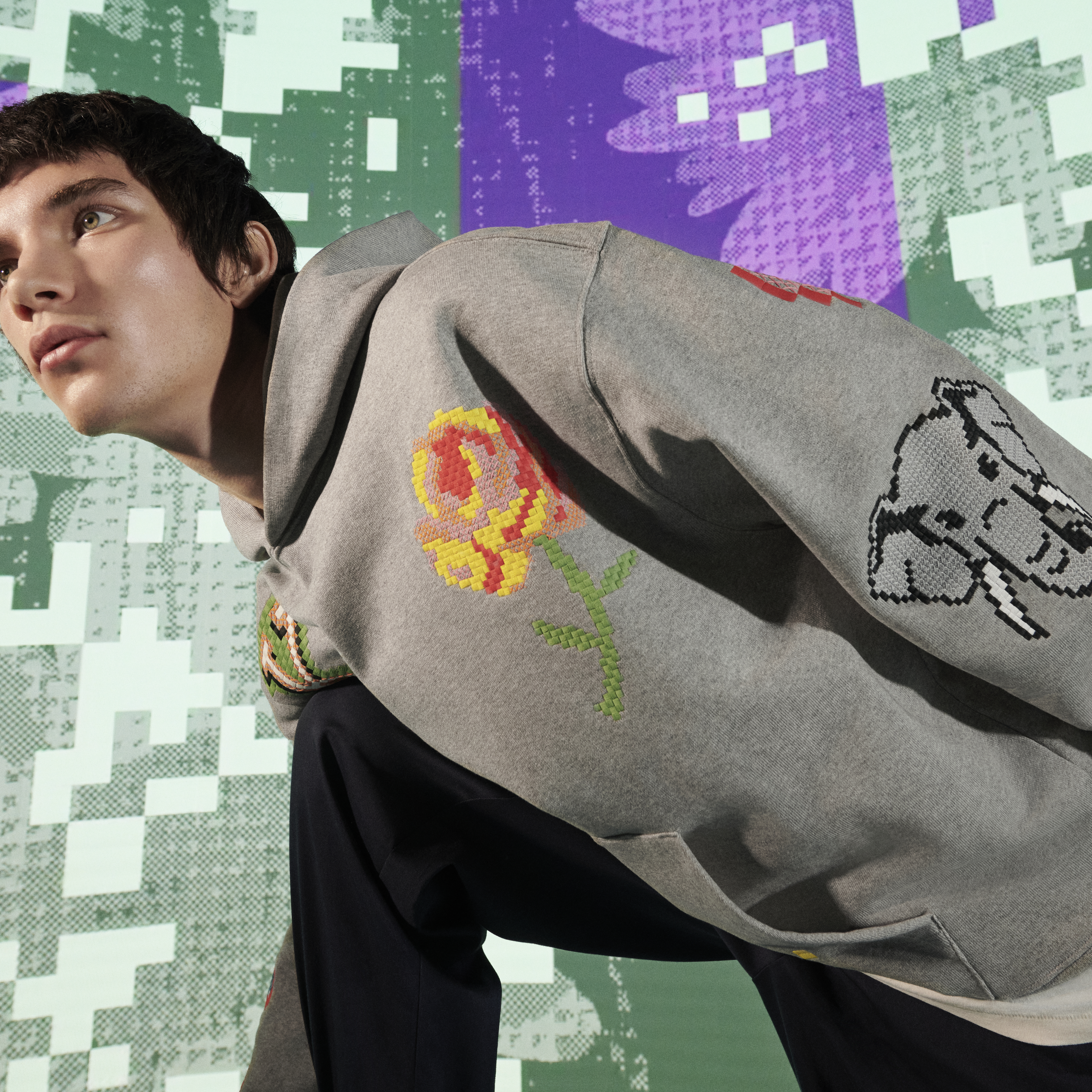 Họa tiết hoa hồng Pixel màu xanh/xám có pixel được sử dụng để trang trí trên áo khoác denim có khóa kéo và quần dài dành cho nam giới, trong khi phiên bản màu đỏ/nâu của họa tiết này xuất hiện trên bộ đôi quần và áo hoodie cài khuy denim dành cho nữ giới.
