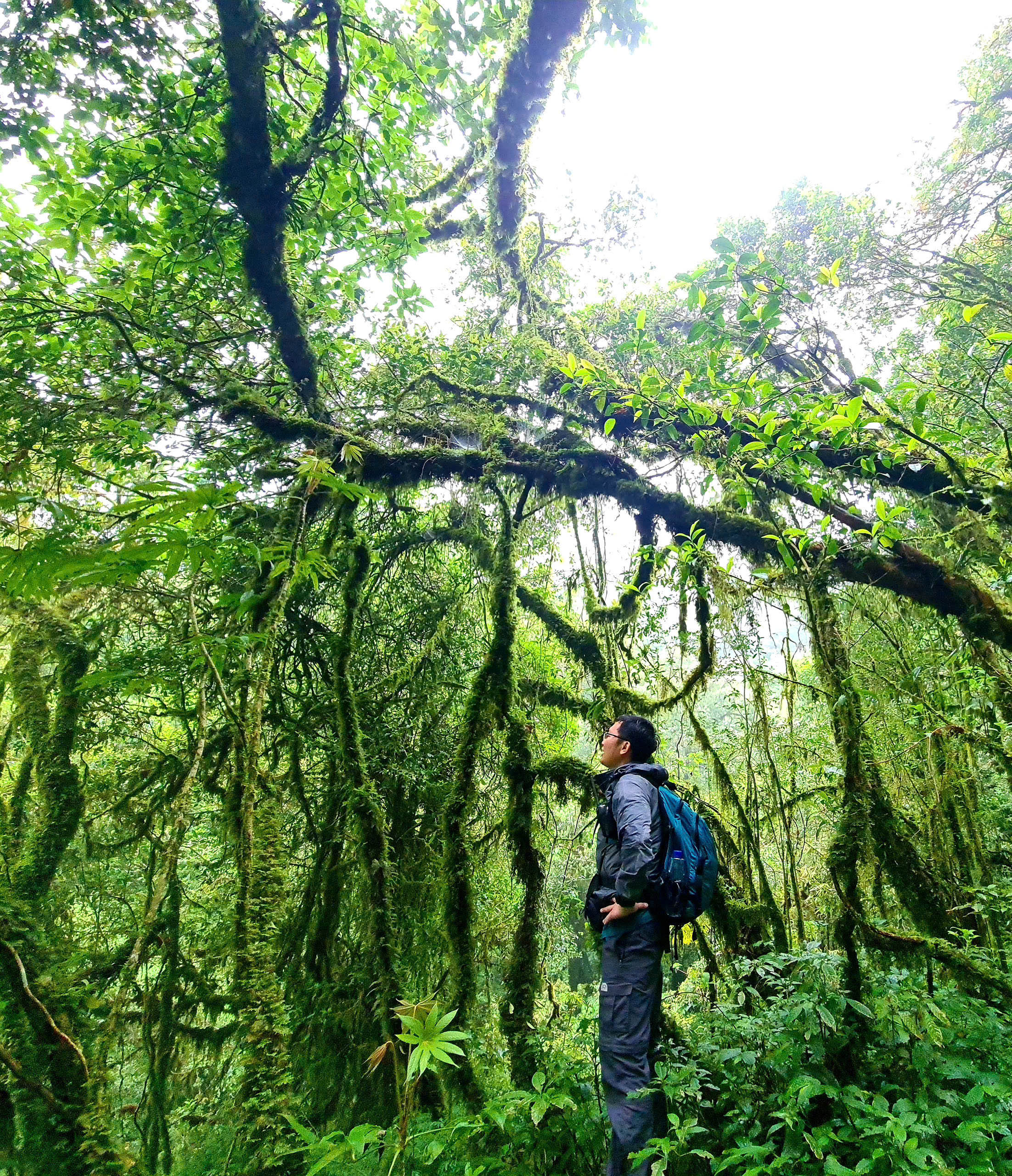 Miệt mài leo khoảng 3h, tôi đến điểm nghỉ trưa là một lán thảo quả nằm giữa rừng của người dân, xung quanh có khá nhiều loại đỗ quyên đang nở hoa. Ở độ cao khoảng 2.200m, thường chỉ có đỗ quyên màu hồng và trắng, các loại màu khác sẽ mọc ở nơi cao hơn. Tôi không khỏi trầm trồ vì kích thước những cây cổ thụ nơi đây, cảm giác mình thật nhỏ bé, lọt thỏm trong khu rừng khổng lồ. Những tán cây rộng xòe bóng tròn dưới nền trời xanh, chúng không hề đan vào với nhau mà luôn chừa ra một khoảng trống. Đây dường như là cách giao tiếp của thực vật, cũng là sự kì diệu của tự nhiên khi chừa ra những khoảng nắng cho các loài cây bên dưới.