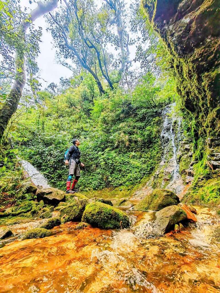 Dù đã đi nhiều đỉnh núi cao ở Việt Nam, nhưng tôi vẫn không khỏi choáng ngợp bởi độ dốc của hướng leo này. Dốc đứng đầy thử thách, nhiều đoạn ngẩng đầu lên có thể đánh rơi mũ trên đầu. Bù lại, không khí giàu oxy, mát mẻ khiến trải nghiệm trekking giảm đi đôi phần cực nhọc.