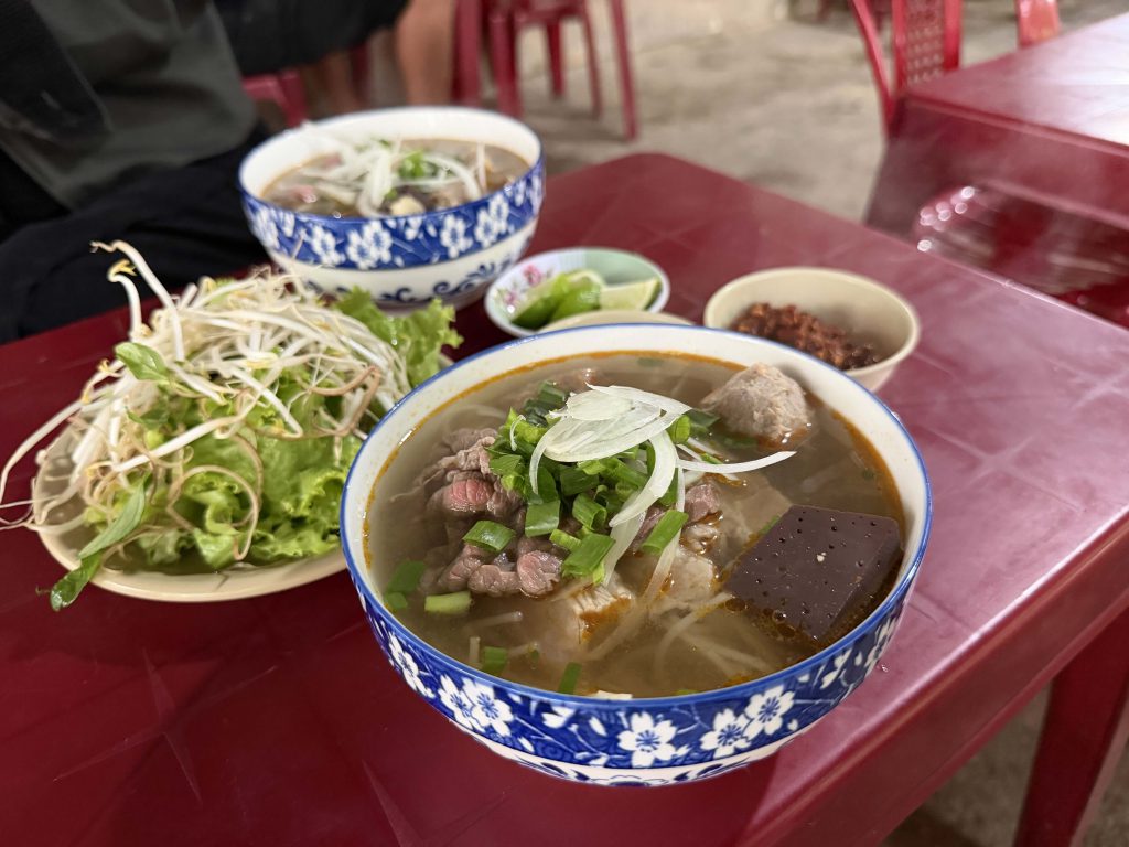 Một tô bún đầy đủ có chả bò, thịt, giò heo, huyết; cay nhẹ với màu ớt phi, dậy mùi sả và ruốc Huế – thứ gia vị đặc trưng tạo nên vị ngọt thanh mà đậm đà. Giá mỗi tô đặc biệt “full toping” có giá 50.000 đồng, với những bát bình thường thì có giá 30.000 đồng.
