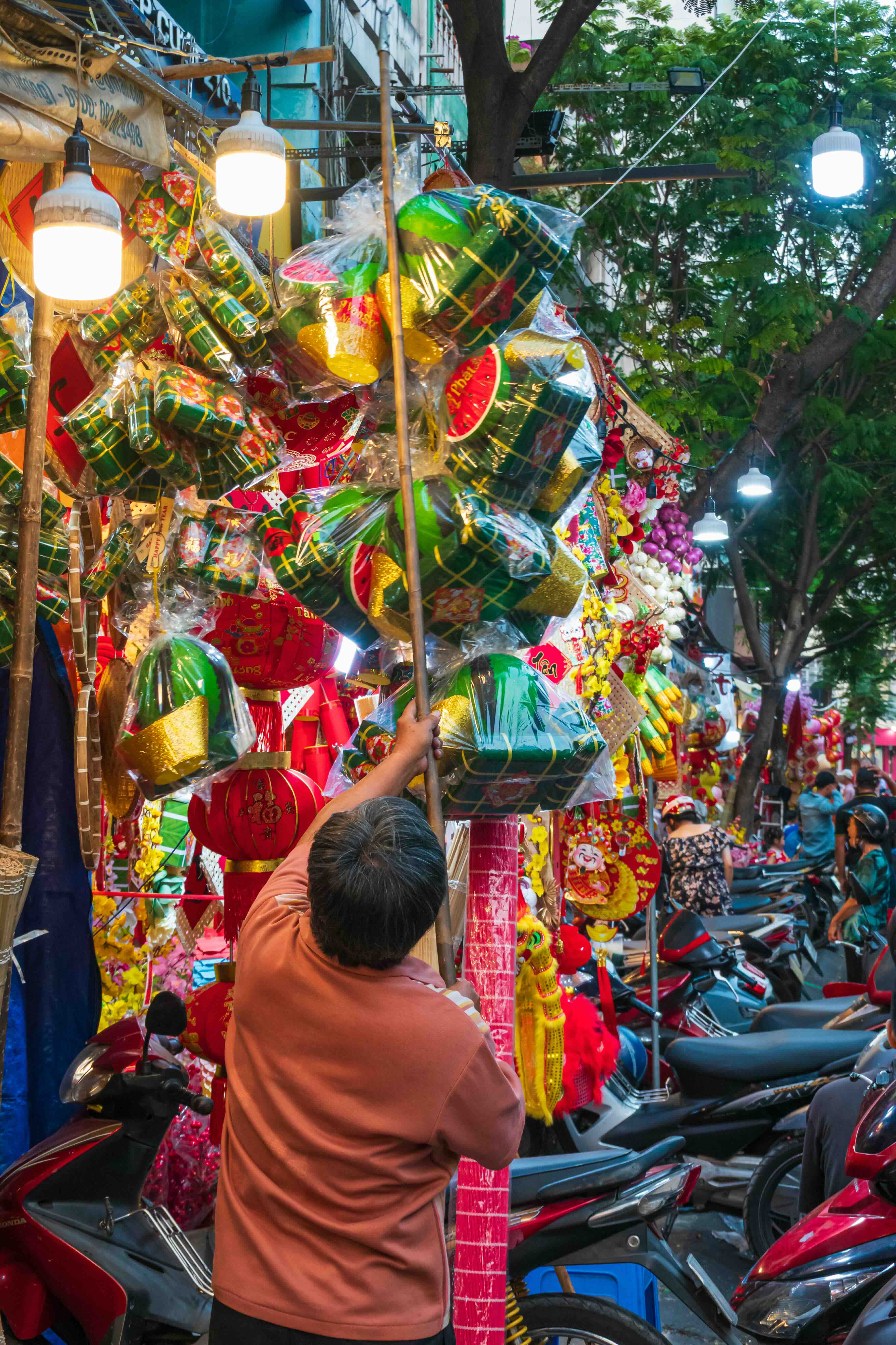 Từ những ngày đầu tháng Chạp, Chợ Lớn – khu phố người Hoa lớn nhất Thành phố Hồ Chí Minh – đã rộn ràng không khí mùa xuân: những dãy đèn lồng đỏ rực, tiếng người cười nói xôn xao, mùi nhang trầm thoảng nhẹ trong không khí. Nơi đây bước vào Tết theo cách rất riêng: sớm hơn, sâu hơn và đậm đà hơn bất kỳ khu chợ nào khác trong thành phố. Chợ Lớn dịp Tết giống một đại sân khấu sống động, nơi văn hóa – tín ngưỡng – ký ức cùng lúc hiện diện. Không chỉ là nơi mua sắm, mà đến đây ta có thể tìm lại nếp xưa, với những món bánh tổ, cặp câu đối đỏ, dây pháo giấy… Tất cả gợi lên hình ảnh cái Tết mang đậm bản sắc cộng đồng.