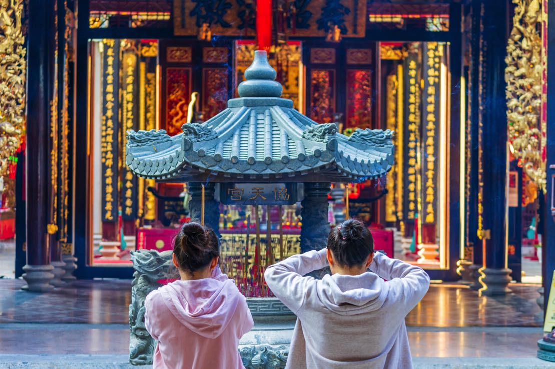 Bên cạnh lễ hội diễu hành đường phố thì chùa Ông và chùa Bà nằm trên đường Nguyễn Trãi, quận 5 cũng là 2 địa chỉ tấp nập không kém. Dân Sài Gòn gọi là chùa Bà nhưng ở đây không thờ Phật, chính xác thì nơi đây có tên là Tuệ Thành Hội quán thờ bà Thiên Hậu. Tương truyền bà là một người có khả năng ban phước lành, che chở cho những người gặp nạn vì vậy rằm tháng Giêng người Hoa thường đến đây để cầu an, cầu phúc cho những người thân trong gia đình. Khu vực giếng trời ở đây được thiết kế để treo những khoanh hương vòng, trong mỗi khoanh hương có một tờ giấy hồng viết tên các thành viên trong gia đình để cầu bình an, tài lộc. Đến chùa vào những buổi sớm xuân khi khí trời mát mẻ, ánh sáng tinh khôi, nhìn những khoanh hương treo trên khoảnh sân đẹp như một tác phẩm nghệ thuật. Bởi thế mà rất nhiều nhiếp ảnh gia đã đến đây để “săn” những khoảnh khắc này.