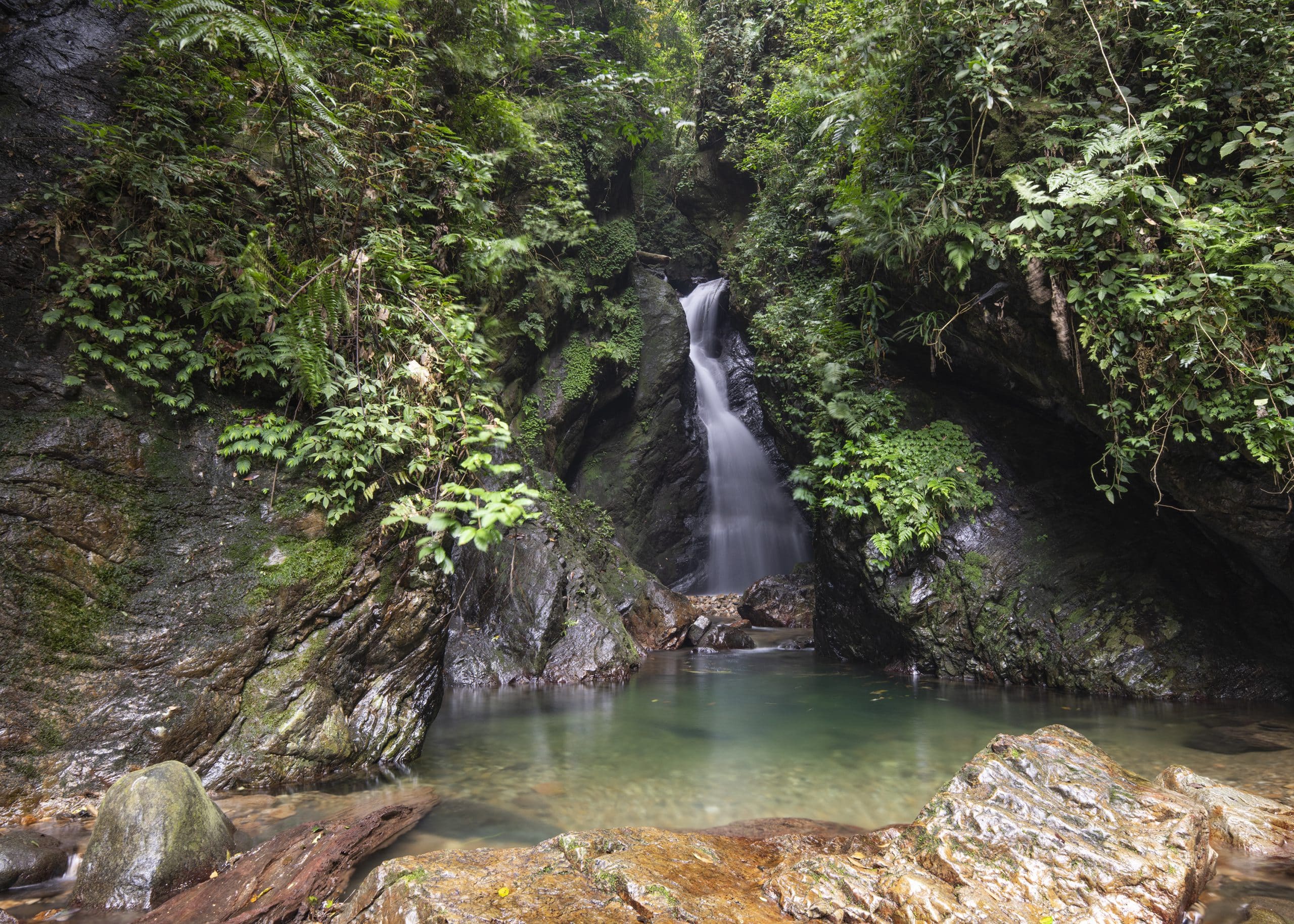 Bình minh lên trong trẻo giữa núi rừng với tiếng chim hót rộn ràng, sương mây bảng lảng trên đỉnh núi. Vườn Quốc gia Xuân Sơn chính là điểm cuối của dãy Hoàng Liên Sơn nên hệ sinh thái rừng trên núi đá vôi ở đây mang đặc trưng điển hình của vùng núi phía Bắc. Rừng nguyên sinh trên núi đá vôi hùng vĩ cùng cảnh quan thác suối, hang động độc đáo. Chúng tôi theo chân cậu bé Hùng để trekking thác Lưng Trời. Đoạn đường trekking khoảng 4km khá vừa sức với đoàn. Các em nhỏ còn có phần nhanh nhẹn hơn người lớn khi phải vượt suối, leo núi. Có những đoạn đường dốc trơn, Hùng phải hỗ trợ hay dừng chờ đoàn khá lâu. Cậu bé ấy cứ thoăn thoát bám chân trên những mỏm đá mà không phải dè chừng. Con thác hiền hòa như mái tóc thướt tha hiện ra, dưới chân thác là vũng nước nhỏ cho chúng tôi thỏa sức vui đùa. Hùng chỉ lên cao tít và kể rằng vào mùa nước về, thác đổ xuống ầm ầm tung bọt trắng xóa, đường lên thác sẽ không hề dễ dàng.