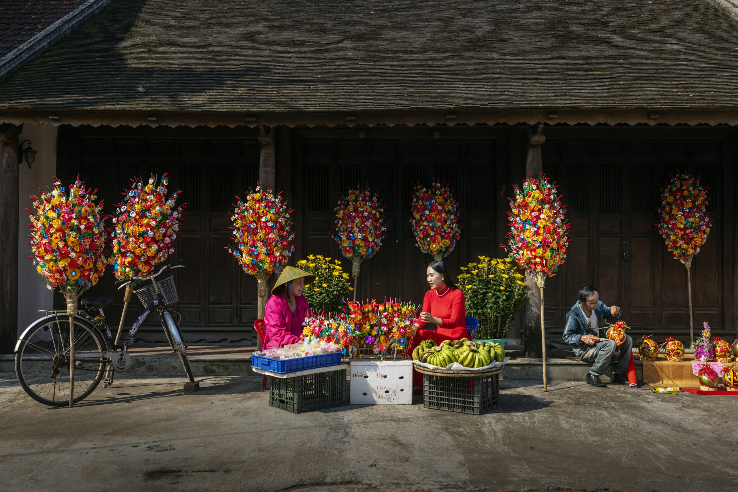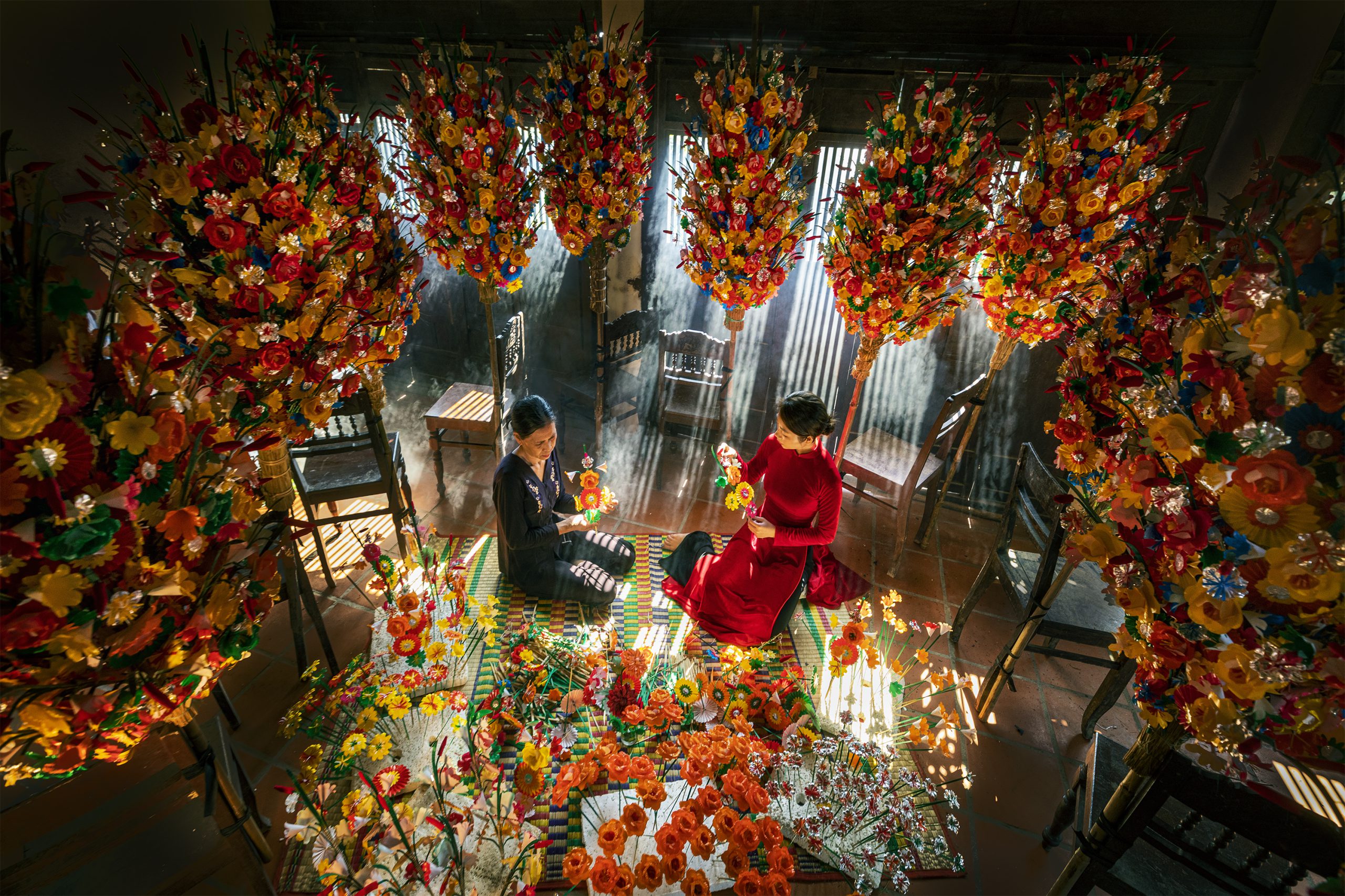 Sau khi làm đủ số lượng hoa cần thiết, người Thanh Tiên thường bó rơm vào cây tre để tạo thành cây Chông, dùng để cắm các cành hoa. Những cây Chông này thường được chuyên chở bằng thuyền, hoặc xe đạp, hoặc xe máy, hoặc đơn giản hơn là vác trên vai của người bán, đi khắp phố phường ngõ xóm trong thời gian sắp Tết. Người xứ Huế và khu vực thường mua một vài cặp hoa giấy dùng để cúng trên trang thờ Bổn mạng, am Cảnh, cúng Ông Táo, Thổ Công. Những cây hoa này được dùng trong suốt một năm, đến Tết năm sau, họ lại mang xuống đốt đi và thay thế bằng những cành hoa mới.