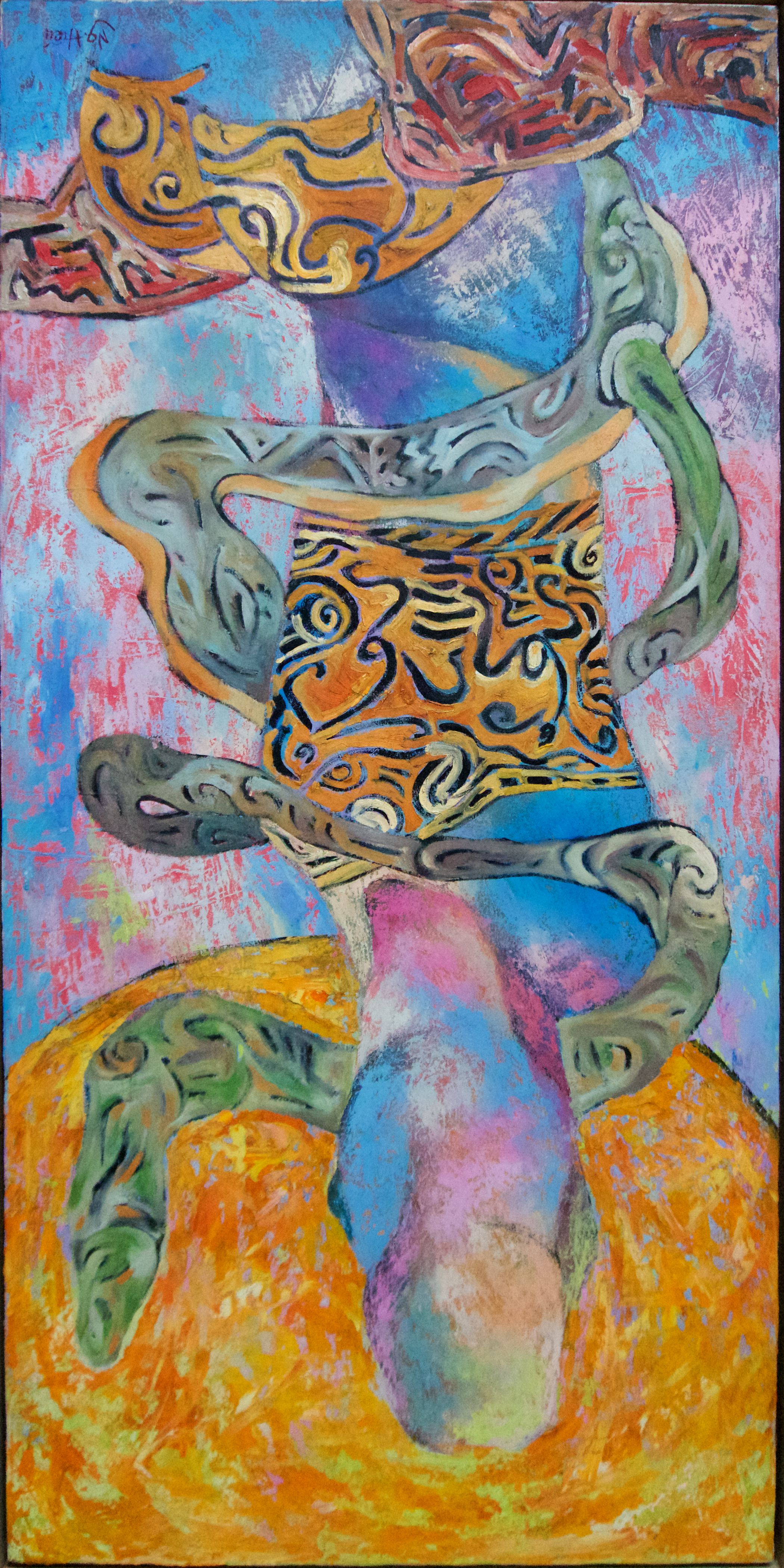 Tung hoành với chất liệu sơn dầu, họa sĩ Bùi Quốc Khánh sử dụng phong cách Pop và cách nhìn mới mẻ trong tác phẩm “H’reng trong bảo tàng”. Hình ảnh cô gái Tây Nguyên với ánh mắt u buồn ngước nhìn trời cao, xã hội thừa mứa vật chất, nhưng giá trị lịch sử, văn hóa thì chỉ còn trong bảo tàng. Chủ đề tranh có phần châm biếm xã hội đương đại, về một nền văn hoá đậm đà đang dần và có thể biến mất vĩnh viễn nếu chúng ta không có hành động thực sự. Cũng khai thác thế mạnh của chất liệu, bộ tranh “Đằng sau cửa cõi tạm I; II” của Nguyễn Minh Hiếu sử dụng các mô típ trang trí đặc trưng của Tây Nguyên, viết nên câu chuyện huyền bí về thế giới các vị thần thường được nhắc đến trong các sử thi, trường ca. Trong phong cách hội họa ấn tượng, “Giấc mơ bản số 2” của Phạm Hà Duy Khánh là một cảm nhận đầy mạnh mẽ về cuộc sống cao nguyên hoang sơ