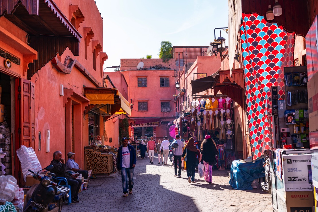 Không biết có phải do mùa xuân hay không mà khi tới Marrakech, nhìn thấy sắc đỏ hồng ngập tràn khắp nơi từ thánh đường cho đến bức tường nhà, con đường trong ngõ, tôi dường như đang nhìn thấy sắc hoa đào, sắc pháo đỏ trong kí ức Tết xưa. Marrakech là thành phố lớn thứ 4 của Ma rốc, sau Casablanca, Fes và Tangier. Trong quá khứ Marrakech từng là kinh đô của Ma rốc đến thế kỷ 13, sau đó nó vẫn là trung tâm thương mại quan trọng và là thành phố nghệ thuật của Ma rốc. Ở Marrakech, ai cũng có thể tìm thấy niềm vui và khám phá những điều thú vị của riêng mình. Những tín đồ shopping sẽ tìm thấy vô vàn đồ da, thủ công mỹ nghệ, gia vị, lụa, len, thảm ở những khu chợ tràn ngập âm thanh, ánh sáng và mùi hương. Những người yêu nghệ thuật và kiến trúc sẽ đắm chìm ở khu vườn Jardin Majorelle – Yves Saint Laurent, cung điện Bahia, học viện Hồi giáo Ben Youssef, bảo tàng Dar Si Said, lăng mộ Saadian và bảo tàng Marrakech (Museum of Marrakesh). Với ai yêu thích nhiếp ảnh thì khu phố cổ medina (tên gọi khu phố cổ có tường thành bao quanh) với những khung hình đời thường sẽ là nguồn cảm hứng bất tận. Đối với tôi, đến Marrakesh là để đi lạc vì ở đây bản đồ giấy hay GPS trên điện thoại ở khu phố cổ medina đều không thể hoạt động. Cứ một ngõ này lại thông sang một ngõ kia, lắt léo chằng chịt như mê cung. Điều thú vị rằng cho dù đi lạc chăng nữa nhưng mỗi ngõ nhỏ lại ẩn giấu một điều thú vị và bất ngờ về Marrakesh. Để mình lạc trôi ở một nơi nào đó không theo lịch trình, không theo những gì trong sách nói âu cũng là một cái thú. Marrakesh lúc đầu có thể làm tôi bối rối khi quá đông đúc và có gì đó xô bồ nhưng càng ở lâu thì thành phố này như một thế giới bí ẩn mà càng tiến sâu vào nó, càng cảm thấy khó mà dứt ra được.
