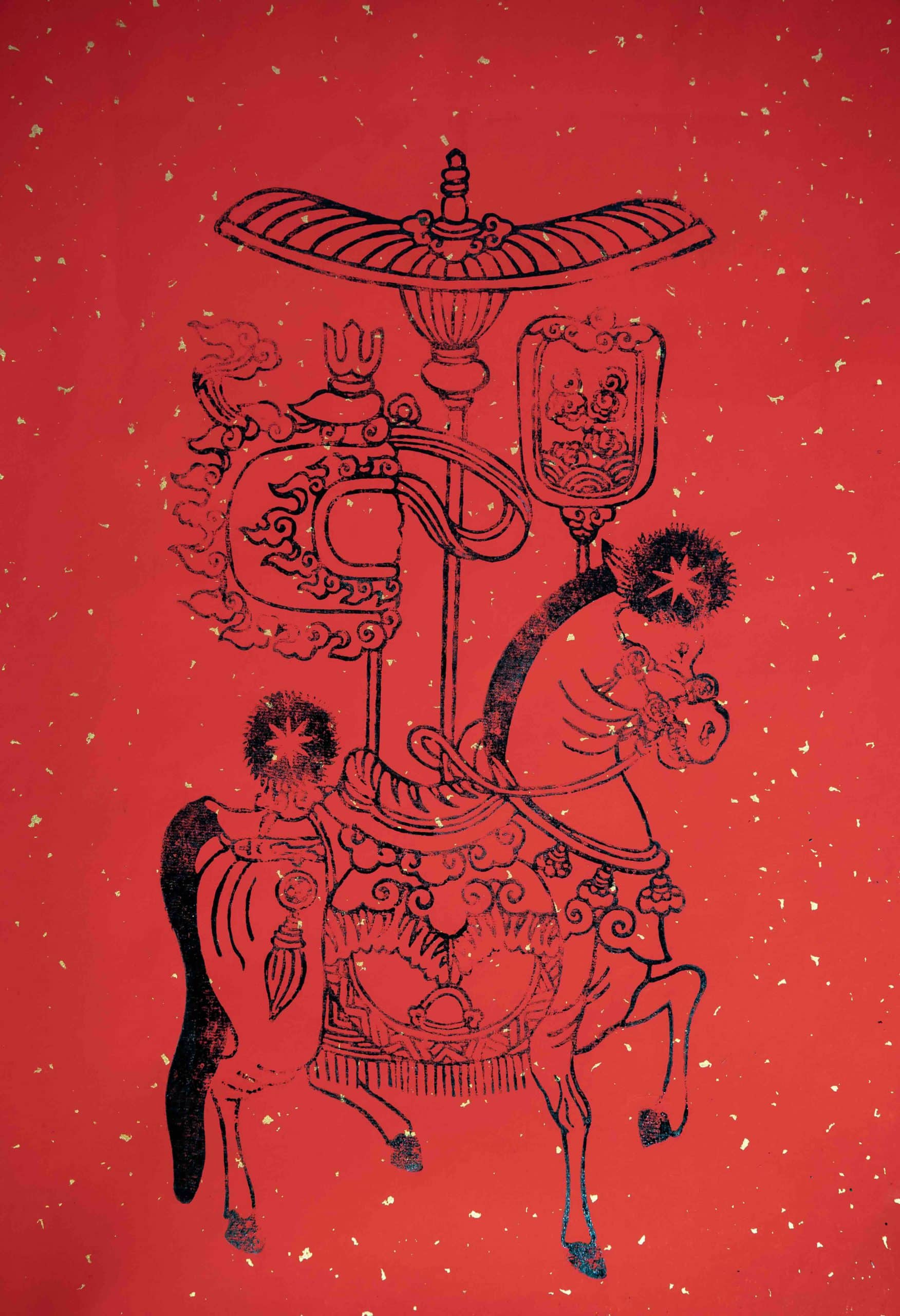 Nhưng chính sắc thắm ấy, tưởng như luôn hiện hữu trong ký ức thẩm mỹ, lại từng biến mất hơn một thế kỷ khỏi đời sống, kéo theo cả một dòng tranh rơi vào im lặng và quên lãng. Kim Hoàng từng phát triển rực rỡ ở vùng ven Thăng Long trong thế kỷ 18 – 19, rồi gần như bị xóa sổ hoàn toàn năm 1915, khi trận lụt sông Đáy cuốn trôi toàn bộ mộc bản của làng, từ đó, chỉ tồn tại ở một vài tư liệu rời rạc còn giữ được tại Viện Viễn Đông Bác Cổ và những ký ức tản mạn của người xưa. Khoảng trống kéo dài ấy khiến Kim Hoàng trở thành một miền ký ức đứt đoạn, gần như không thể chạm tới, càng khó tưởng tượng rằng nó sẽ có ngày trở lại như một tiếng nói hoan hỷ trong mỹ thuật đương đại.