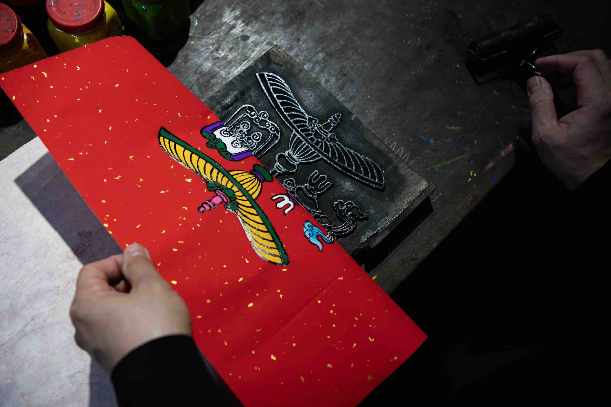Khi Đào Đình Chung bắt tay phục dựng, anh gần như bắt đầu từ con số không. Không còn mộc bản gốc để khảo sát, không còn nghệ nhân truyền nghề, không có hệ quy chiếu kỹ thuật rõ ràng. Thứ Chung có chỉ là vài bản tranh phai màu nằm rải rác trong bảo tàng, vài ghi chép dân tộc học, và ký ức về sắc đỏ treo trên vách nhà những ngày giáp Tết. Từ những mảnh vụn ấy, anh cùng mọi người kiên trì dựng lại cả một thế giới đã biến mất, một thế giới mà phải vừa hiểu qua tư liệu, vừa cảm qua trực giác. Công việc của anh không thuần nghiên cứu mỹ thuật cổ truyền, cũng không thuần sáng tác, mà là tìm tòi ở vùng ranh giới nơi quá khứ và hiện tại giao nhau.