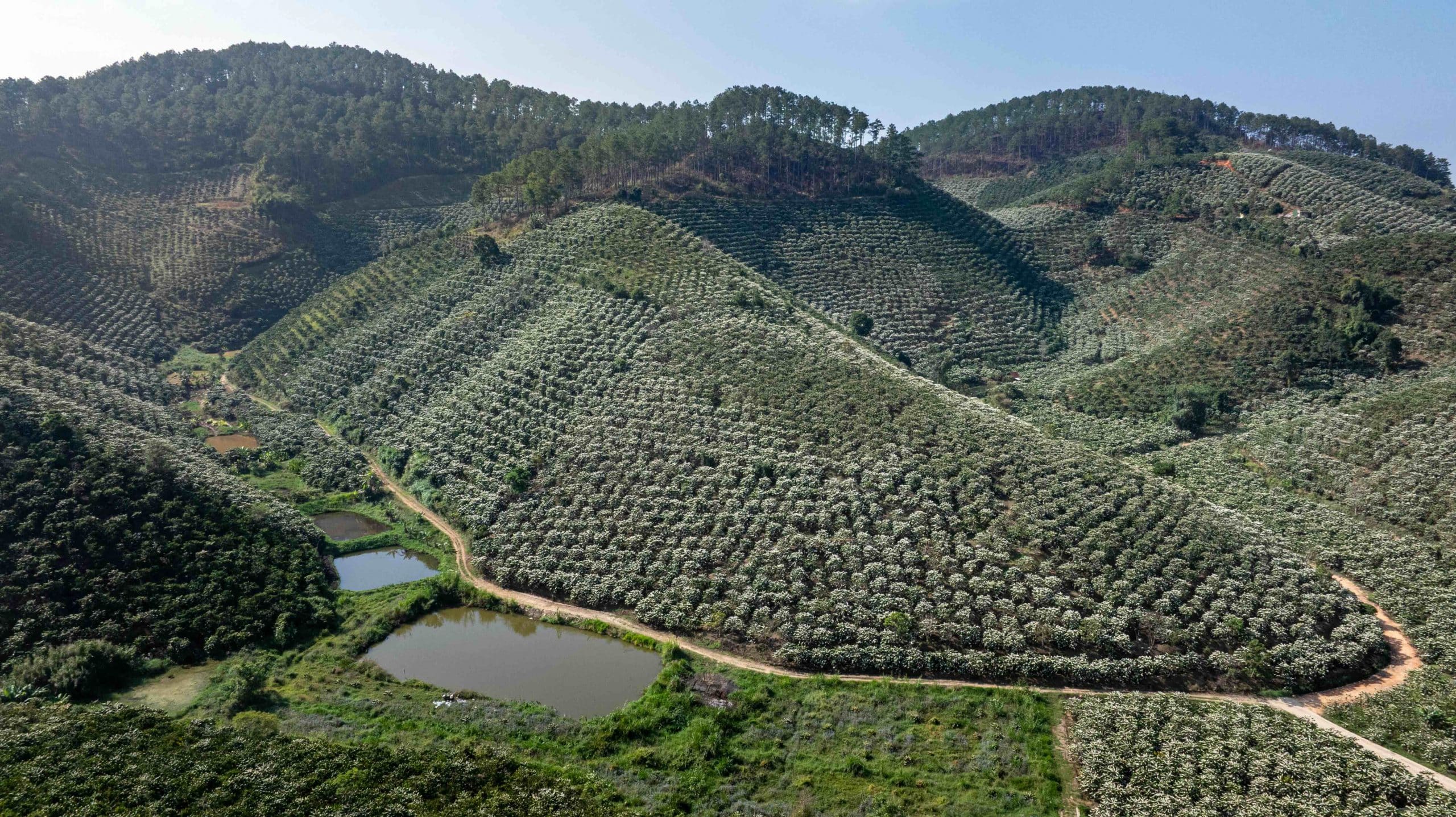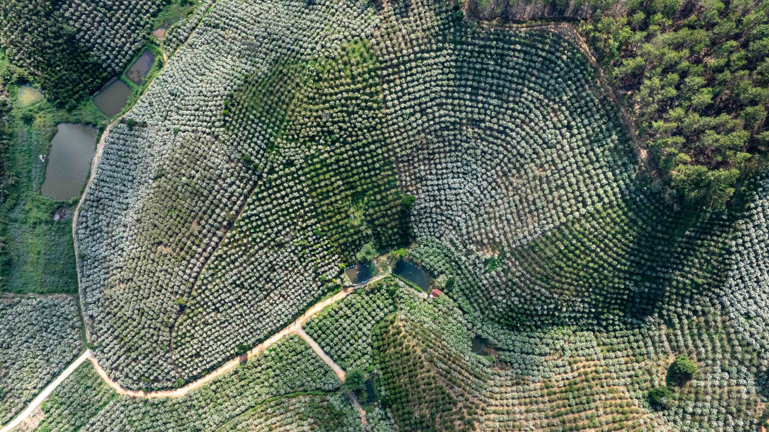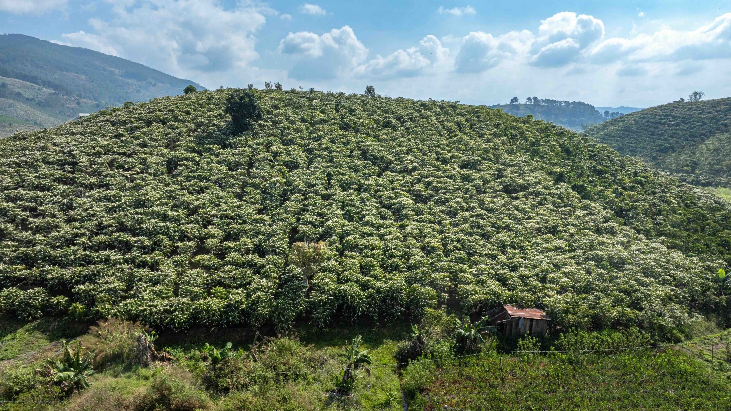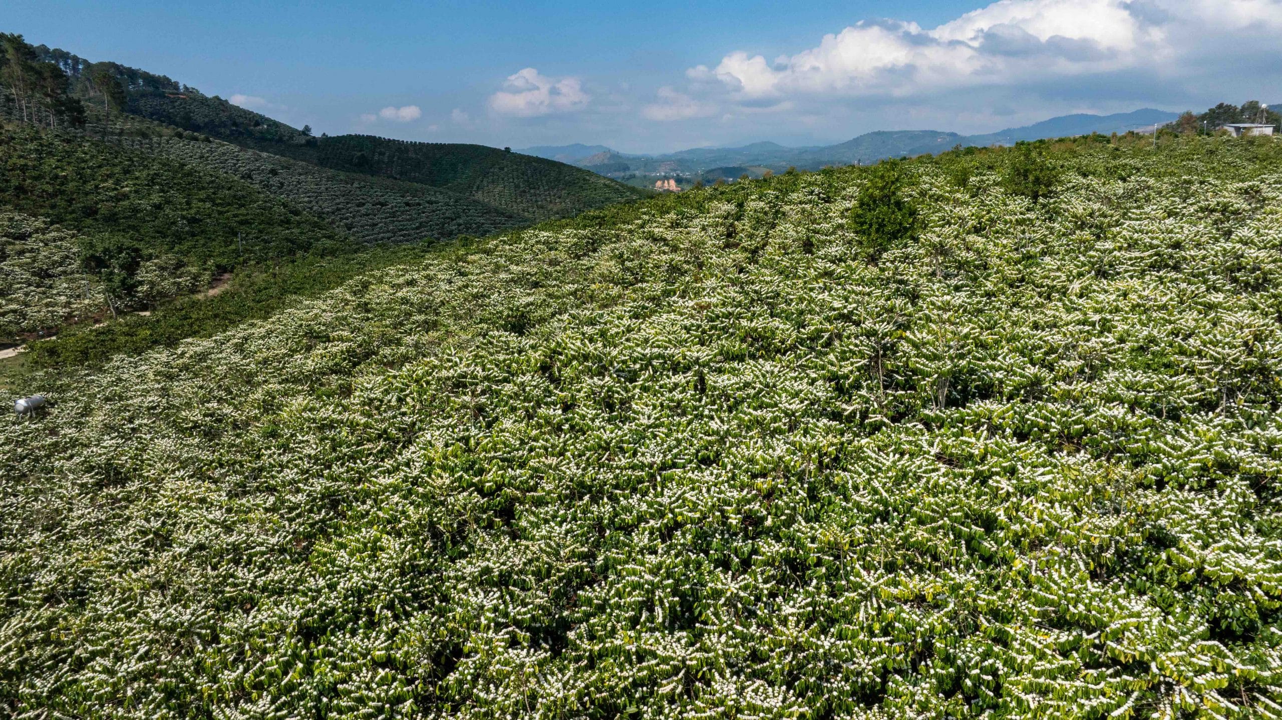 Mùa hoa cà phê không chỉ đẹp để ngắm nhìn. Đó còn là một trải nghiệm trọn vẹn của thị giác và khứu giác. Giữa nền đất đỏ đặc trưng và bầu trời cao trong vắt của mùa khô, những đồi hoa trắng nổi bật một cách rõ ràng. Nhìn từ xa, các sườn đồi như được phủ một lớp bông mịn. Khi tiến gần hơn, từng cánh hoa năm cánh nhỏ xinh hiện ra, trắng muốt và tinh tế.